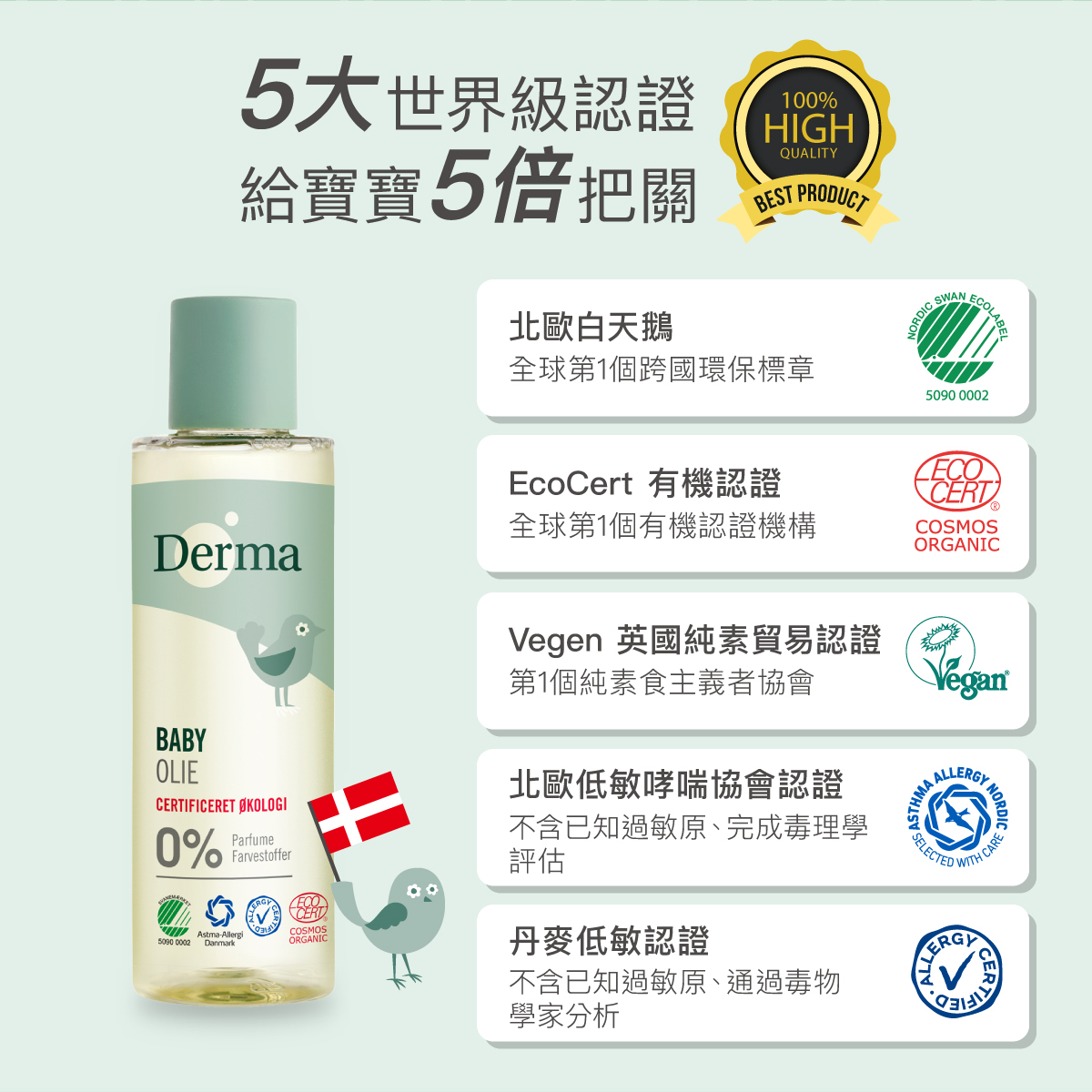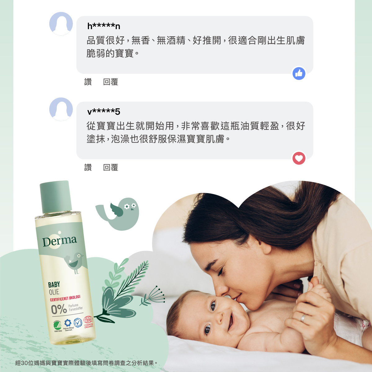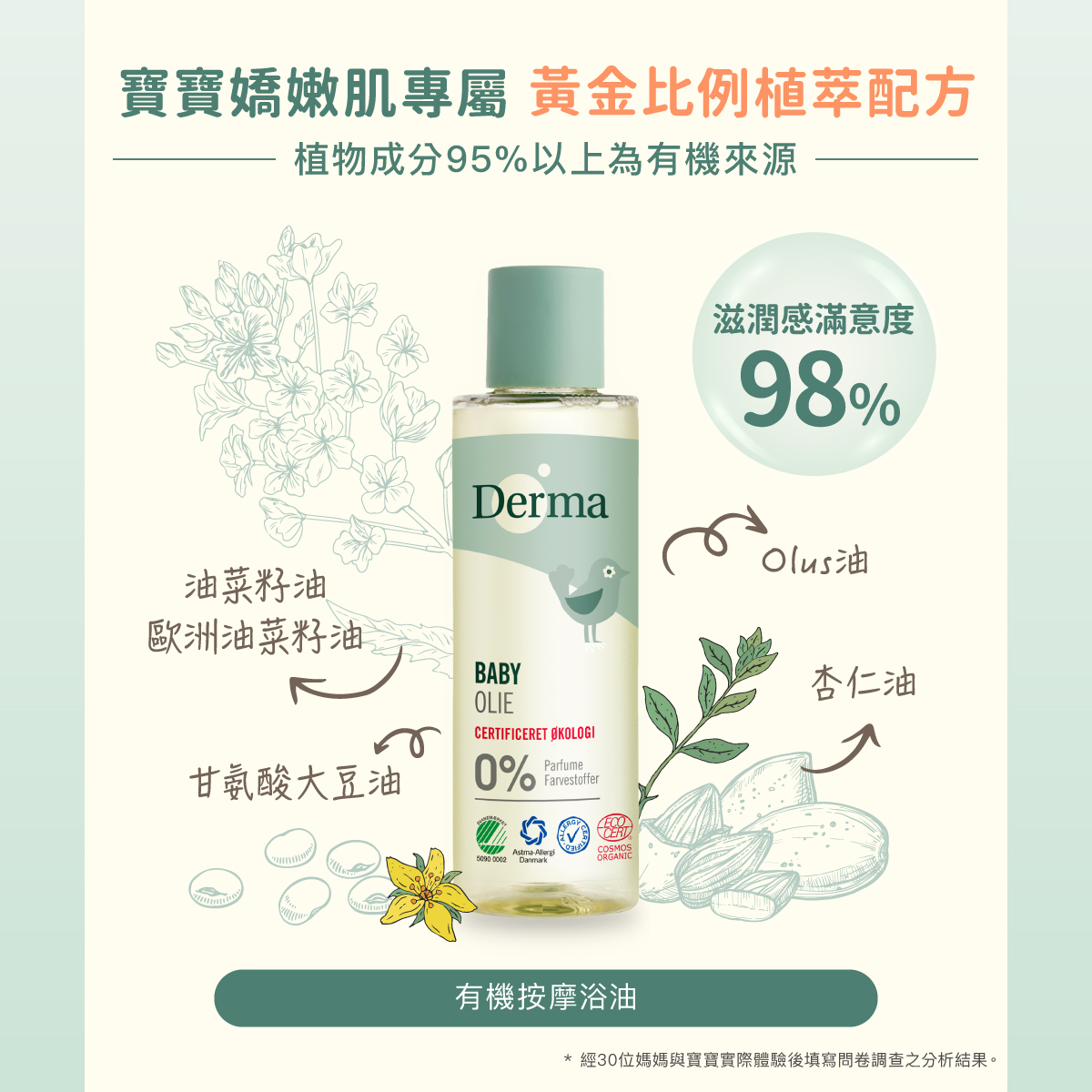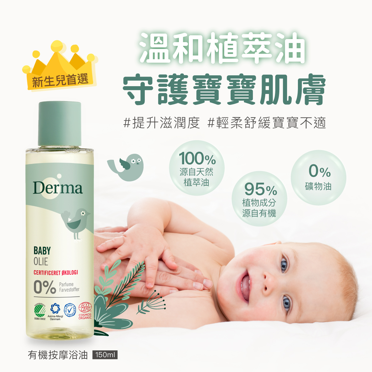 有機、 低敏、 人體無害及環保的寶寶洗護品,堅持使用有機低敏來自天然成分,獨家保濕植萃配方,堅持給寶寶最天然的!Derna寶寶有機按摩浴油質地清爽滑順,能使寶寶肌膚油水平衡、柔軟彈潤;適用於腹部按摩,幫助促進腸胃蠕動,舒緩不適。