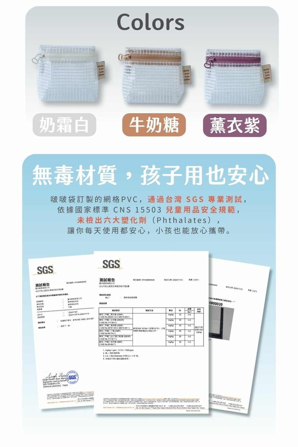 啵啵袋提供三色八尺寸選擇,袋身使用高耐用網格袋材質,不僅防水、防潑水又好清潔,更通過 SGS 無毒檢驗,親子共用也安心。