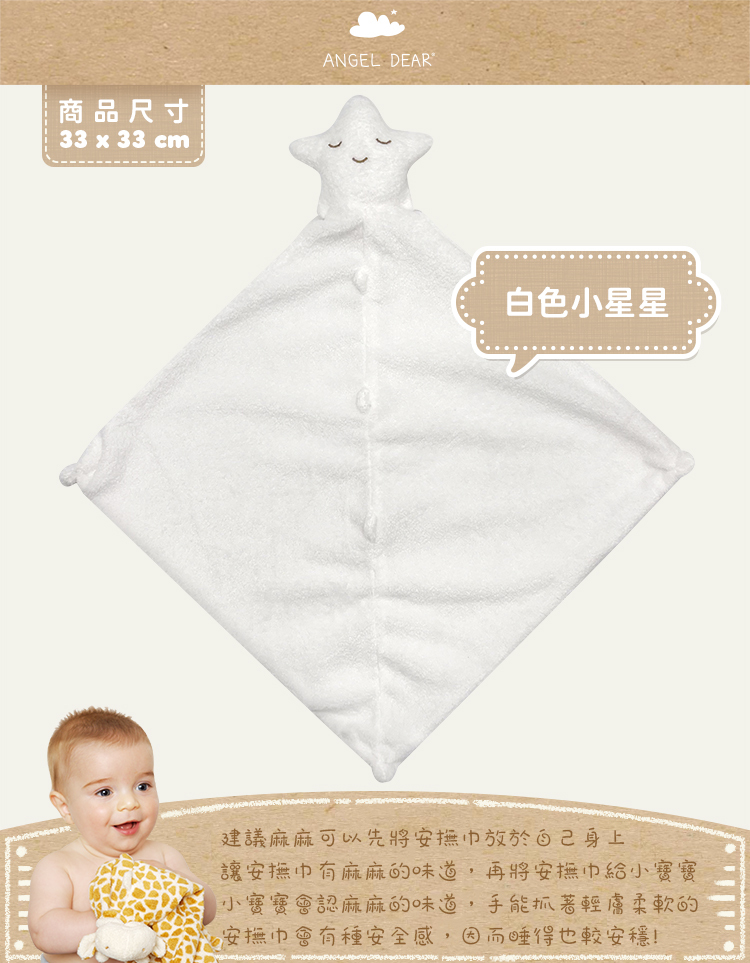 。安撫巾使用方式: 建議麻麻可以先將安撫巾放於自己身上, 讓安撫巾有麻麻的味道, 再將安撫巾給小寶寶, 小寶寶會認麻麻的味道, 手能抓著輕膚柔軟的安撫巾, 便會有種安全感, 因而睡得也較安穩。