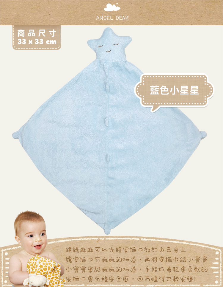 。安撫巾使用方式: 建議麻麻可以先將安撫巾放於自己身上, 讓安撫巾有麻麻的味道, 再將安撫巾給小寶寶, 小寶寶會認麻麻的味道, 手能抓著輕膚柔軟的安撫巾, 便會有種安全感, 因而睡得也較安穩。