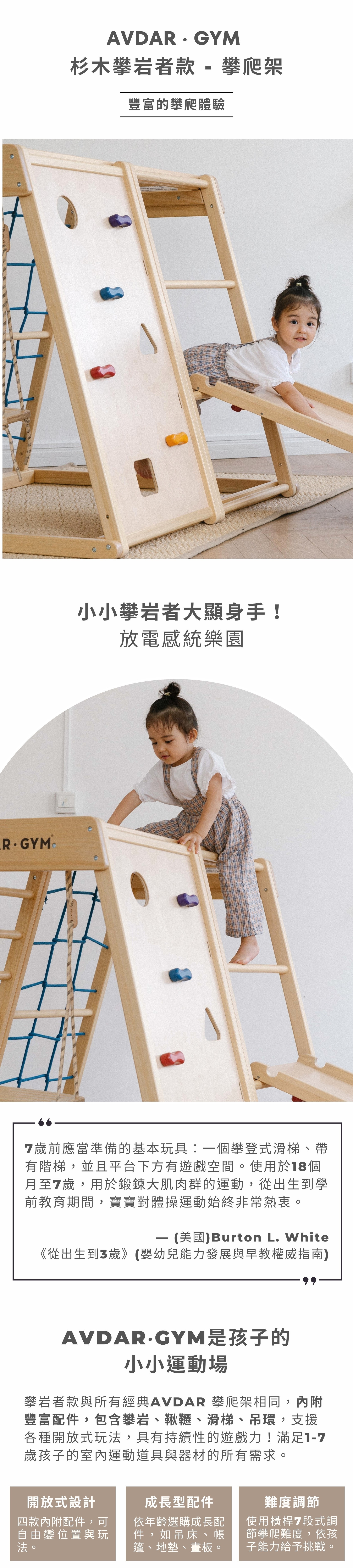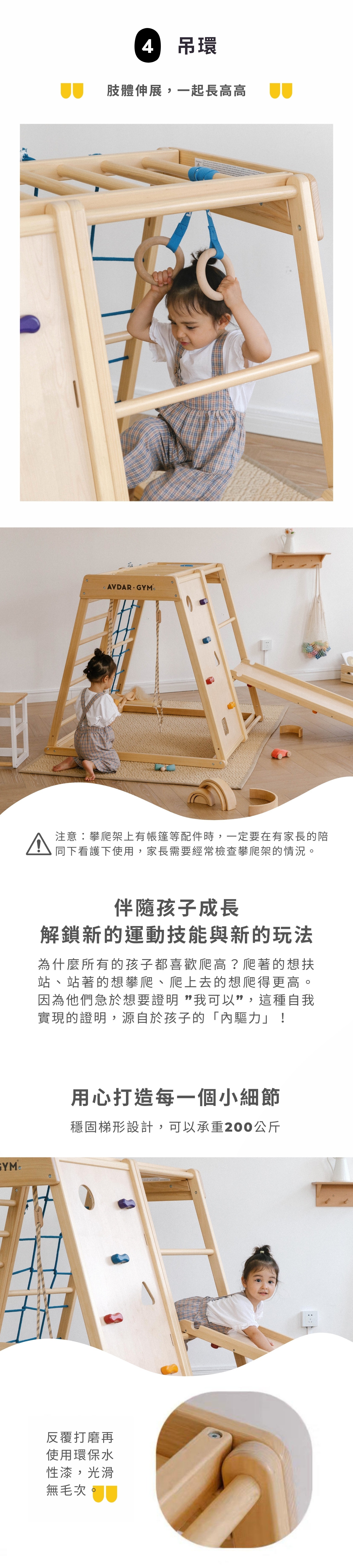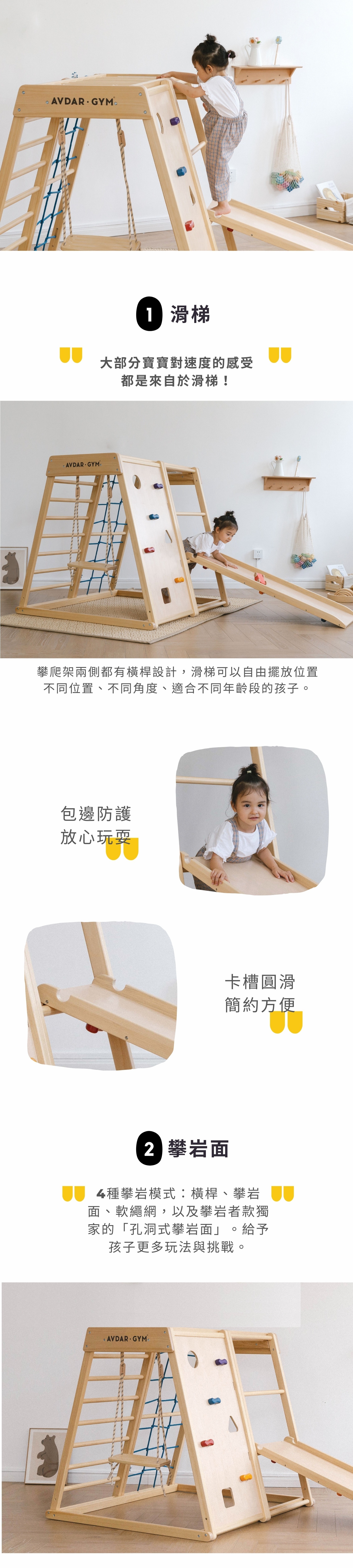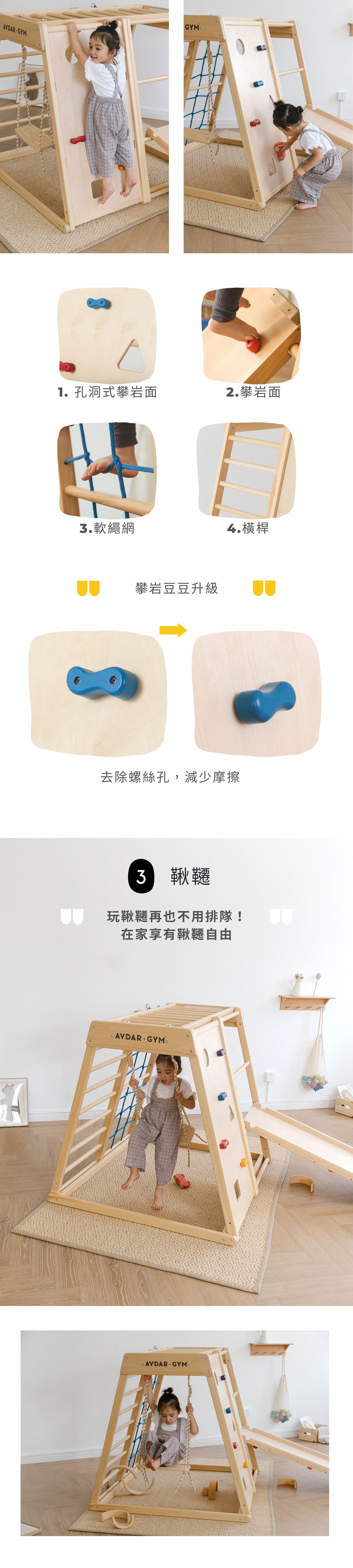 💡 4款攀爬模式:橫桿、攀岩面&孔洞式攀岩面、軟繩網