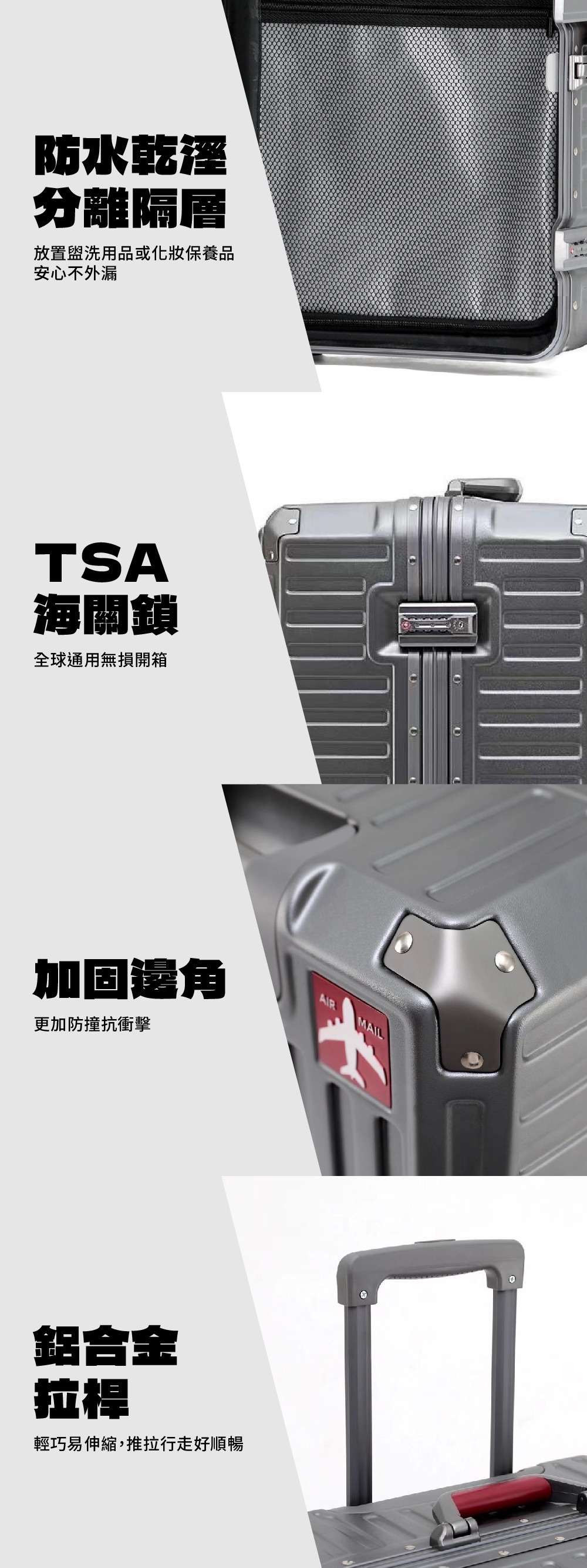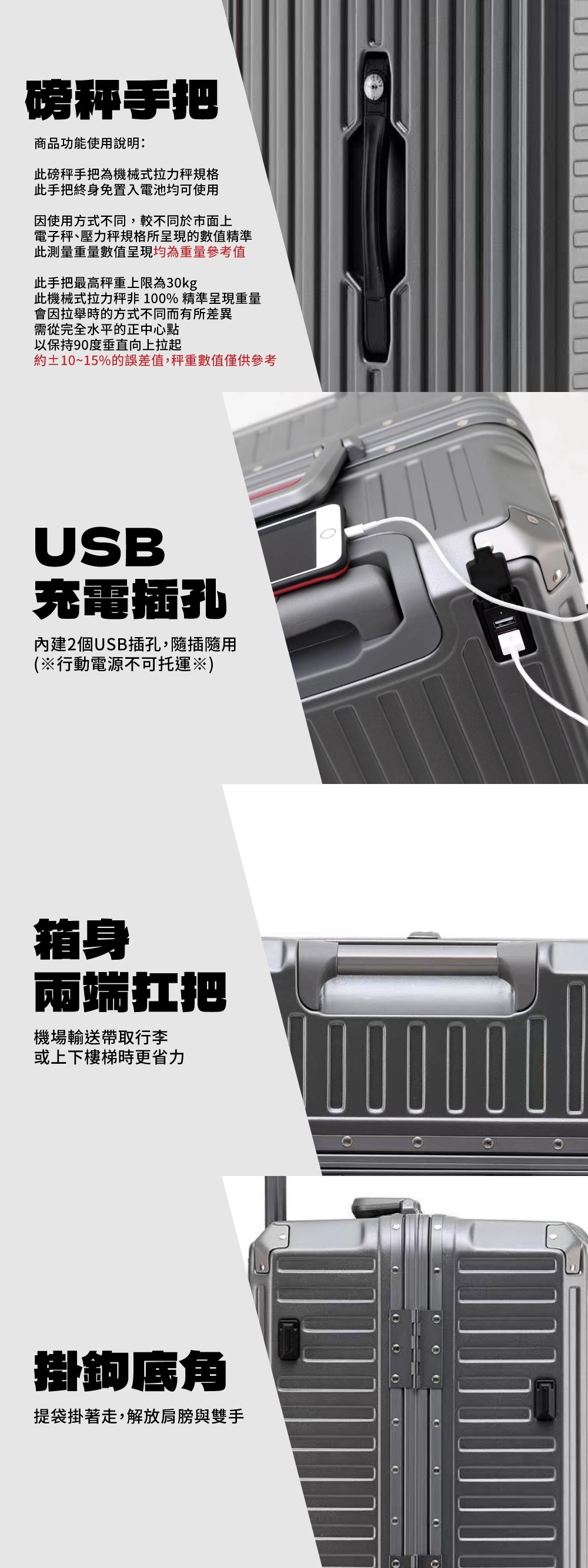1. 將行李平均分攤在行李箱兩側,重物放在底部,保持四輪平行平推為最佳使用方式。