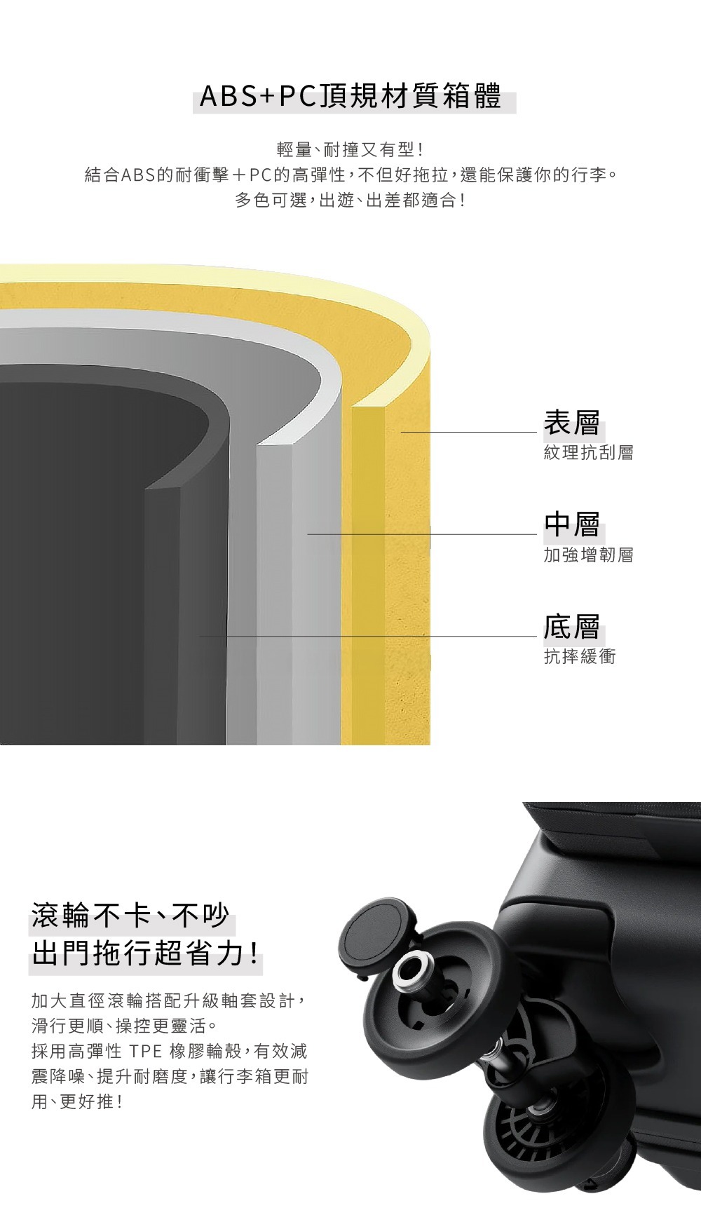 ★ 四輪萬向滑輪 | 滑行平穩、轉向靈活,適合城市移動、地鐵、機場使用。