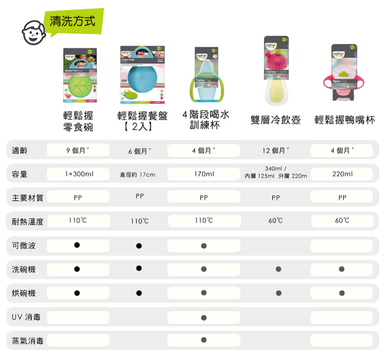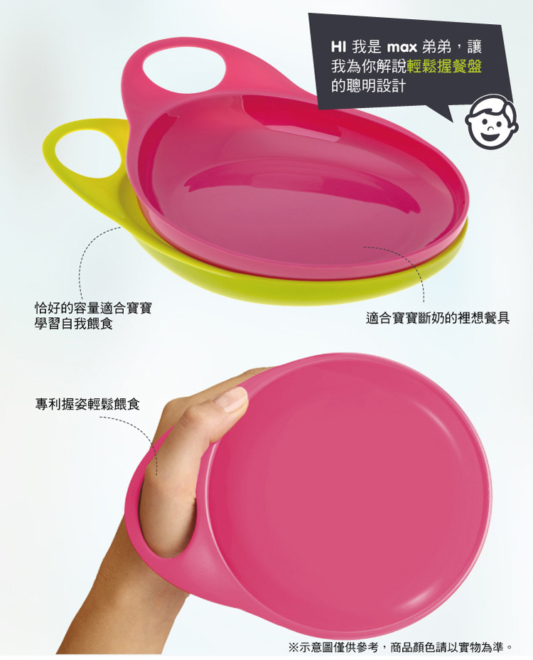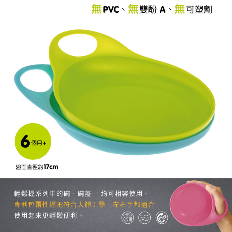 一組共有粉紅色、綠色兩款餐盤,專利獨特包覆性握把的設計,讓左右手都好握,在寶寶進食、家長餵食時,提供您最佳的舒適度與穩定性。