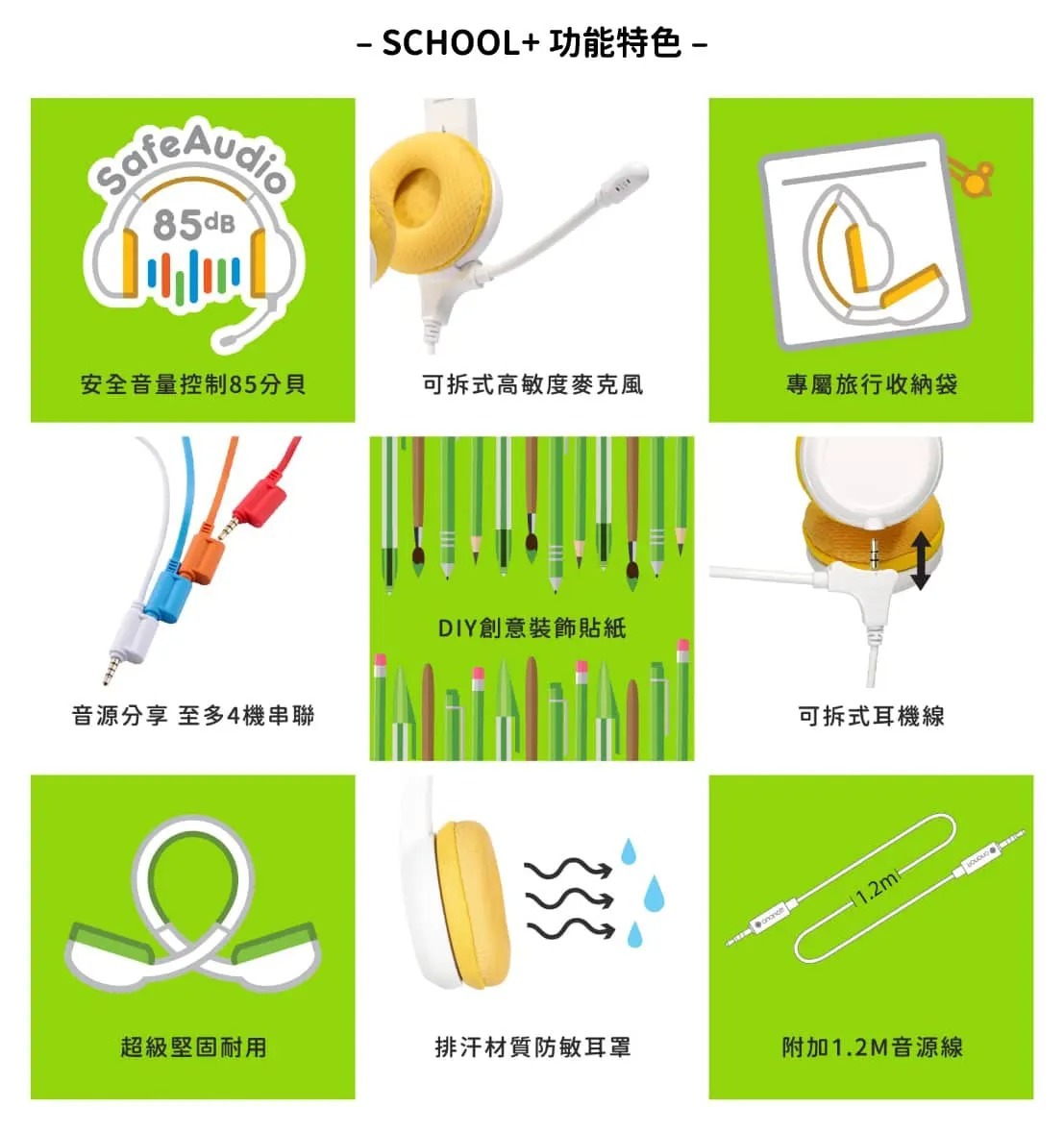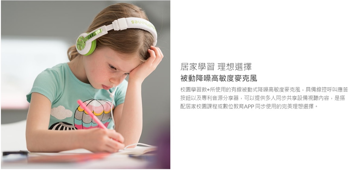 BuddyPhones School+有線校園Plus系列,專門為學校線上課程所設計,也是父母挑選兒童耳機的基本入門款,安全音量控制器,讓最大音量限制在世界衛生組織推薦的85分貝內。最大特色是使用被動式降噪高敏度麥克風,擁有出色靈敏的收音效果,可以有效阻絕所有分散注意力的背景噪音。