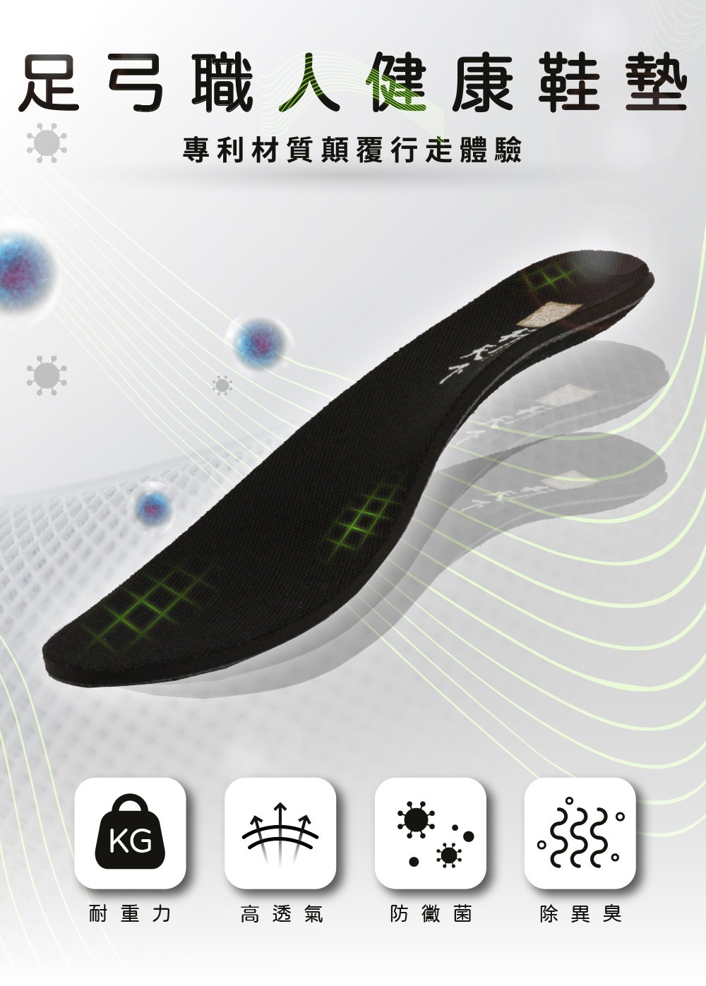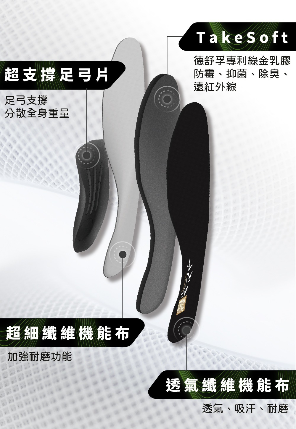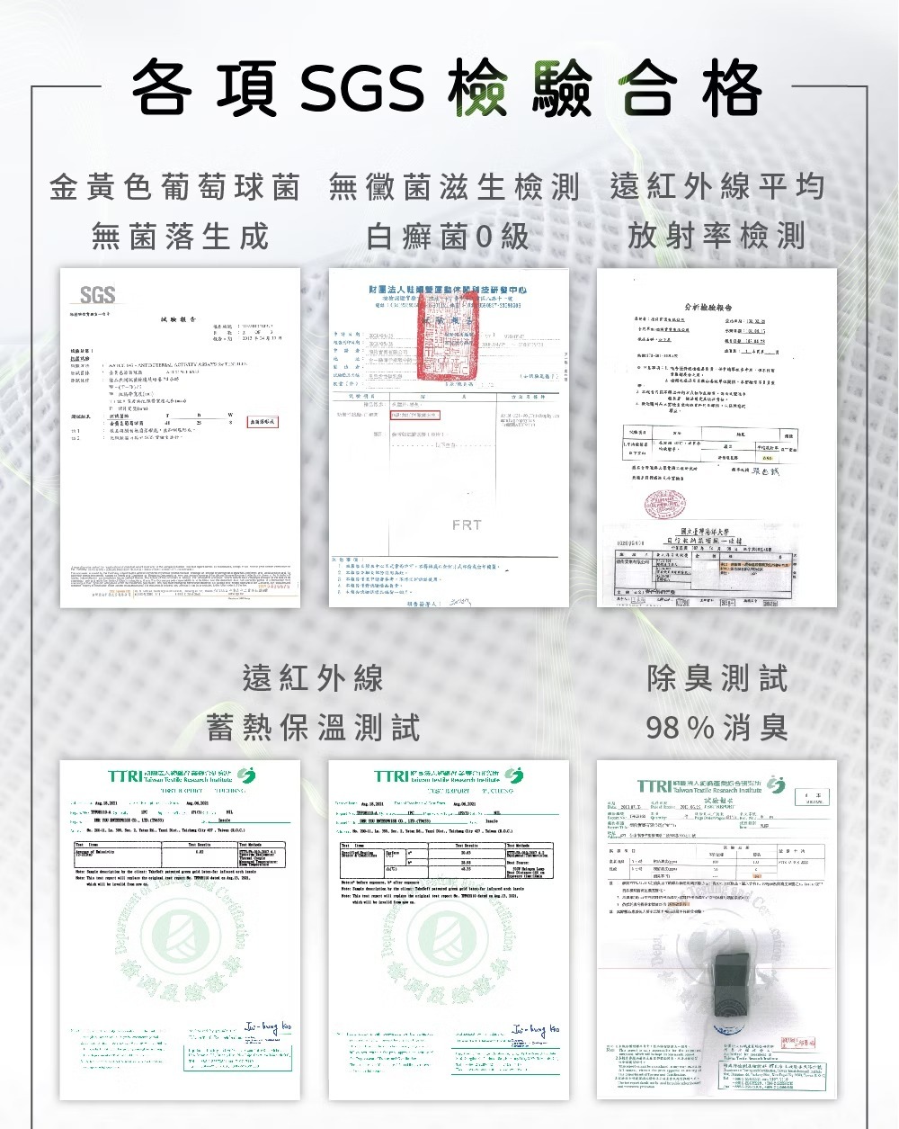.透氣吸濕、遠紅外線、除臭98%、防霉抑菌、回彈減震