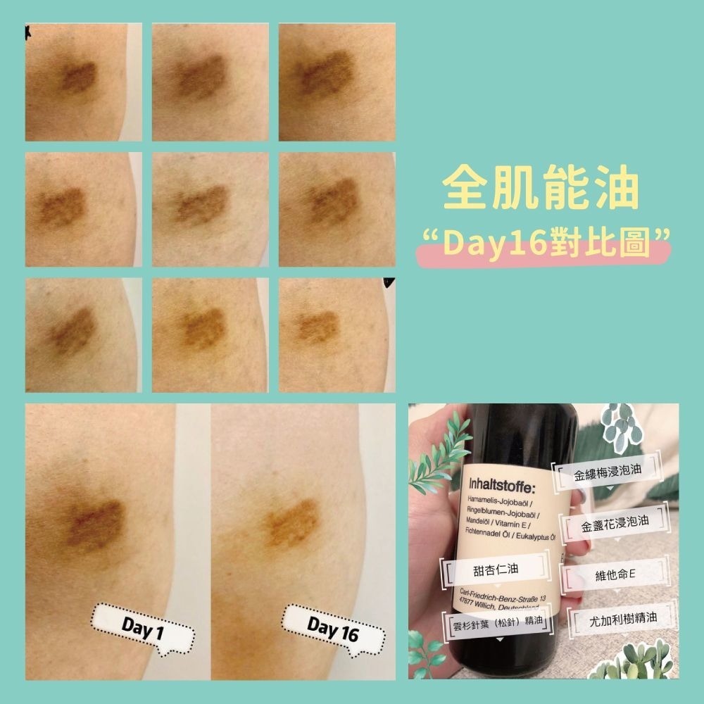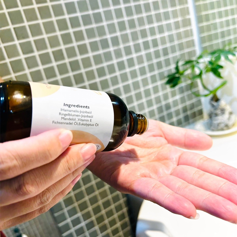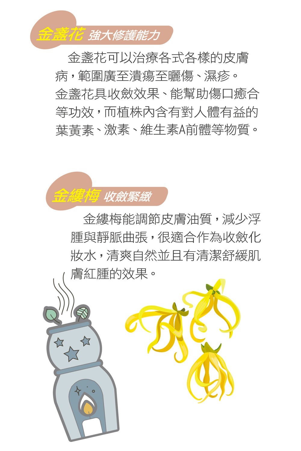 成分:金縷梅浸泡油、金盞花浸泡油、甜杏仁油、百里香精油、薄荷精油、尤加利精油、雲杉針葉精油與維他命E