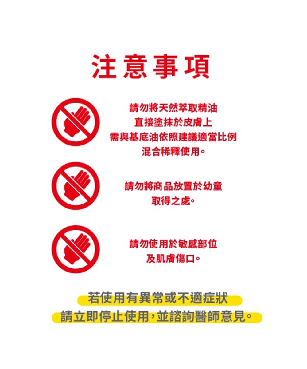 1. 對尤加利(桉樹)精油與雲杉針葉精油有過敏的人禁止使用。
