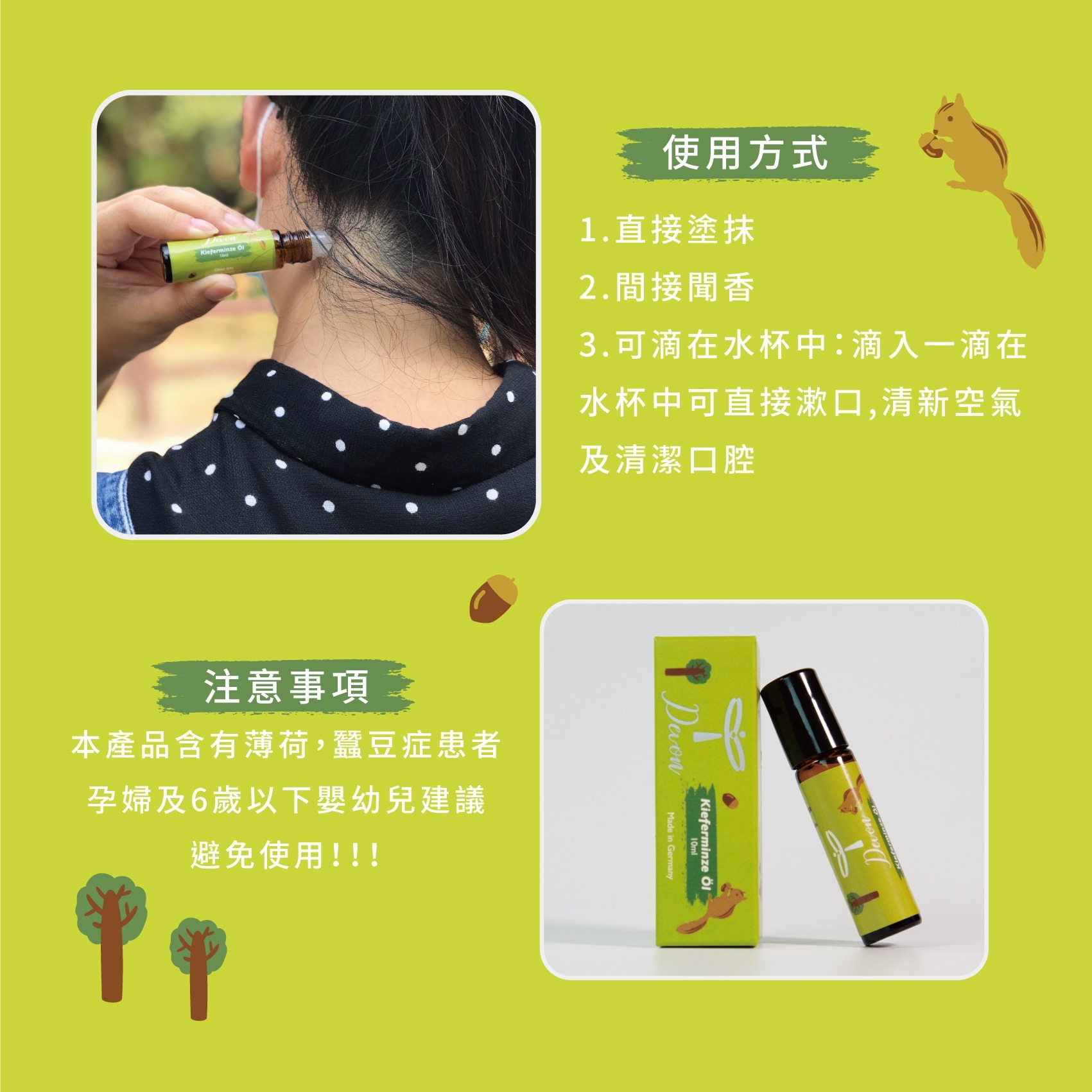 注意事項:本產品含有薄荷,蠶豆症患者、孕婦及6歲以下嬰幼兒建議避免使用