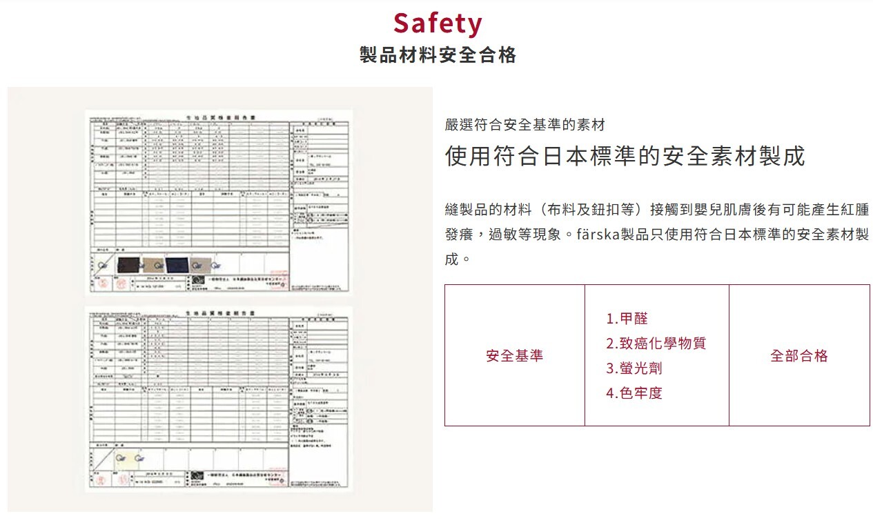 | 產品保證 | Q-TEC標準檢驗合格:色牢度及甲醛等多項細節測試檢驗合格 färska的布製品皆通過日本嚴格的QTEC準檢驗合格 |