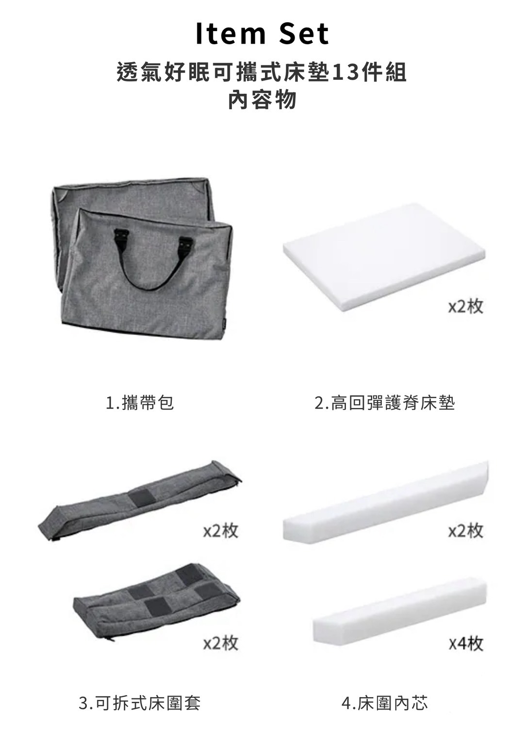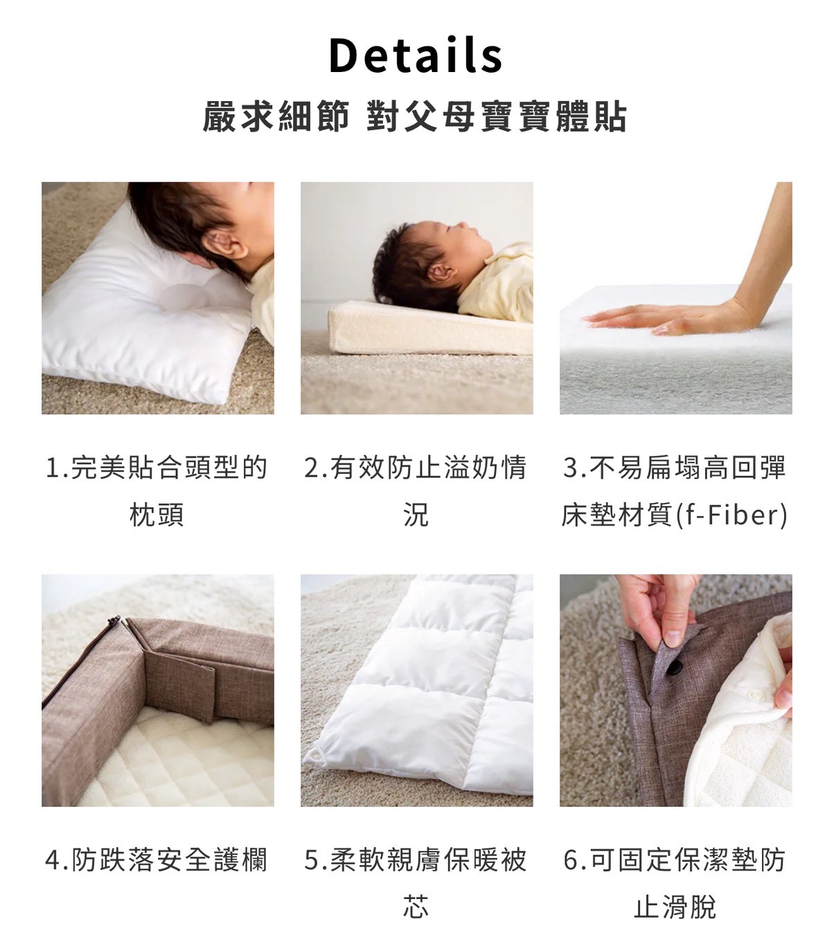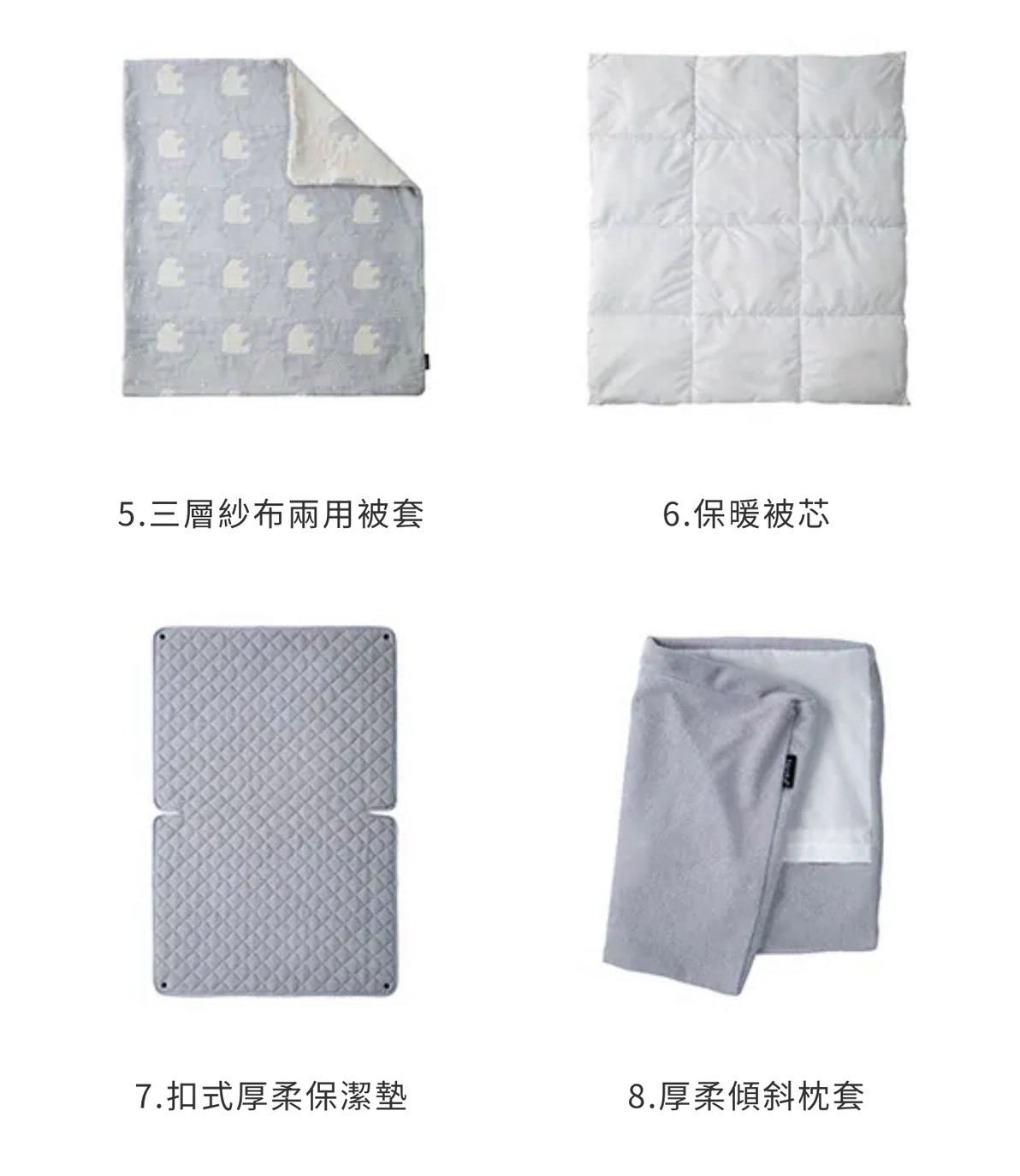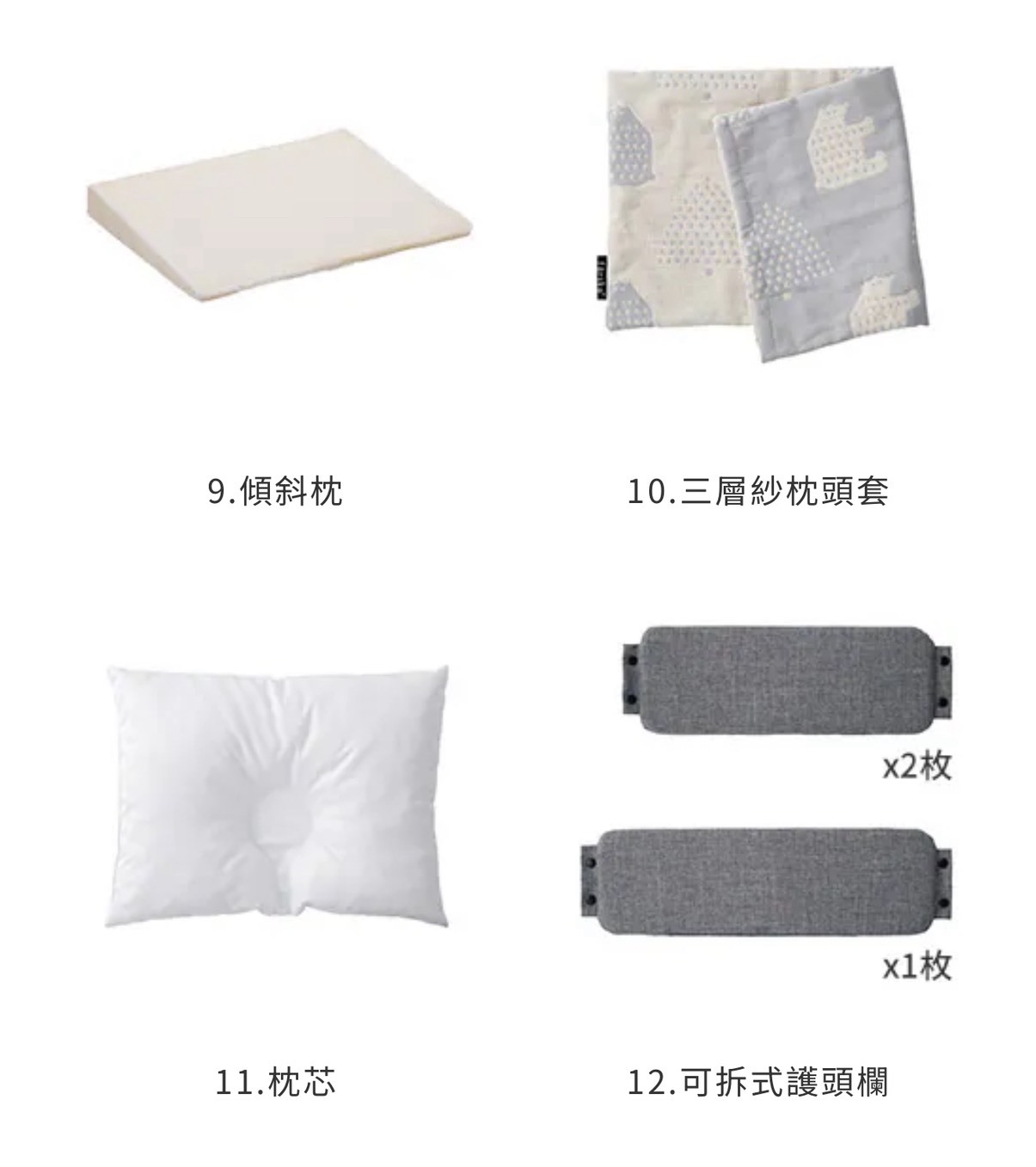▪ 寢具全包 - All in 1內含升級頭枕、護欄等寢具13件組