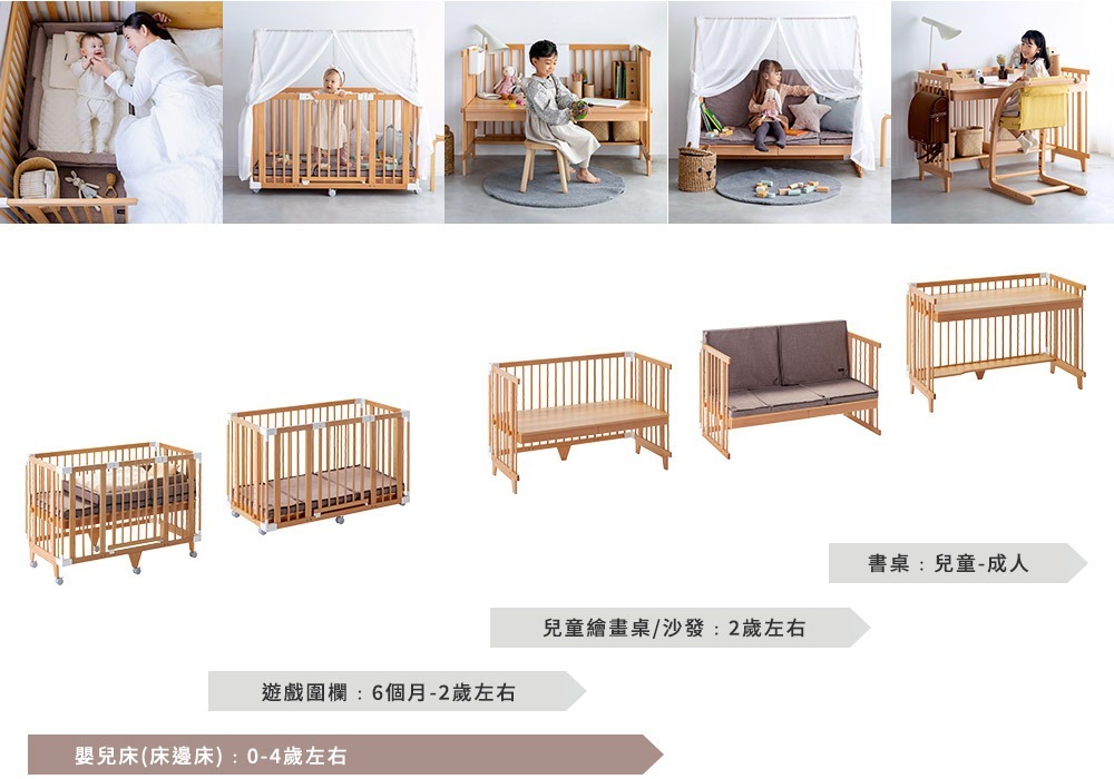 ▪ 五種變化 - 嬰兒床、圍欄、畫桌、沙發、書桌