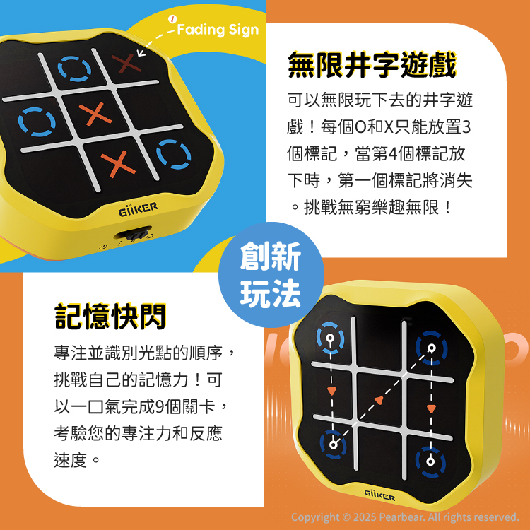 益智井字多功能遊戲機,集合三種創新玩法於一盒的井字遊戲,不僅挑戰專注力與記憶力,還讓經典遊戲煥發新生命,不論是休閒時光、家庭聚會,還是旅途中,都能帶來無限的樂趣與挑戰,是送禮與自用的絕佳選擇!