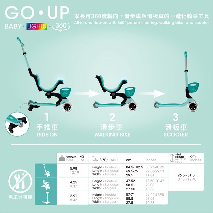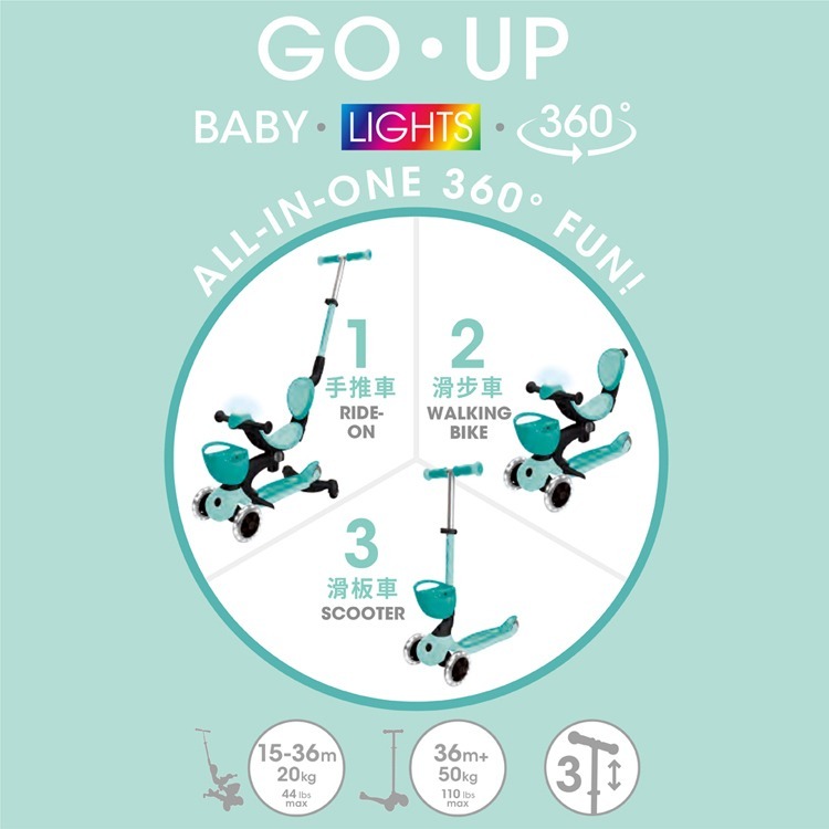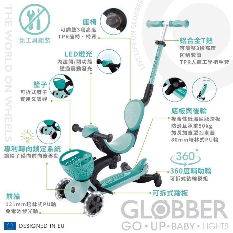 GLOBBER GO‧UP 豪華版360度多功能滑板車(白光發光前輪)-夢幻薄荷綠