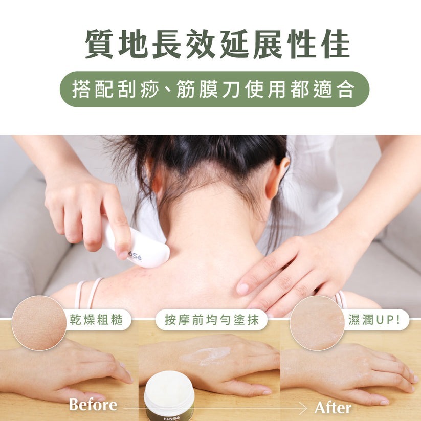 按摩乳為水性質地,擦拭起來清爽不油膩,吸收速度快;舒緩膏偏向油性質地延展度更好,皆可與推拿、刮痧等按摩手法作配合,兩者可搭配使用