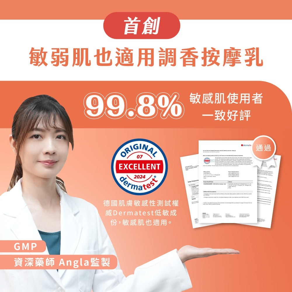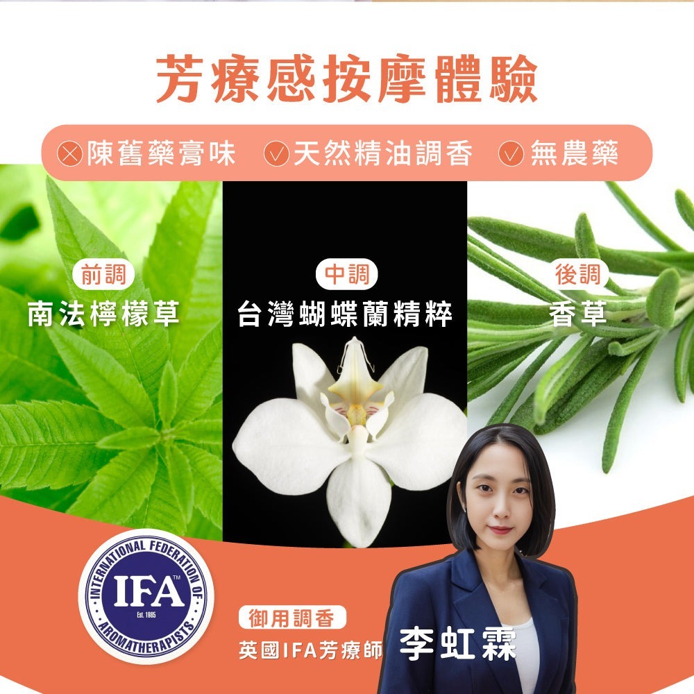 主成分:南法檸檬草精油、日本香草溫感精油(HotFlux®)、台灣蝴蝶蘭精粹(煥白因子)、台東米糠精萃(祛紅不適肌膚)