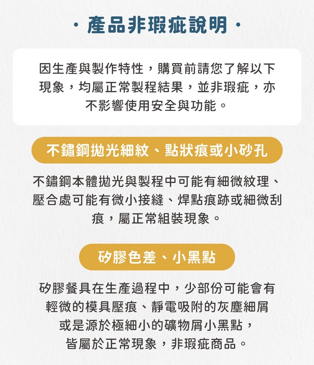 ◆ 不鏽鋼如稍有不平整或拉伸紋路,皆屬製作過程可能出現的現象(非刮傷),因304鋼材較硬,都是正常良品 ◆ 餐具屬於個人衛生用品,售出後概不做退換貨 ◆ 因個人螢幕顯示器不同,產品顏色以實物為主 |