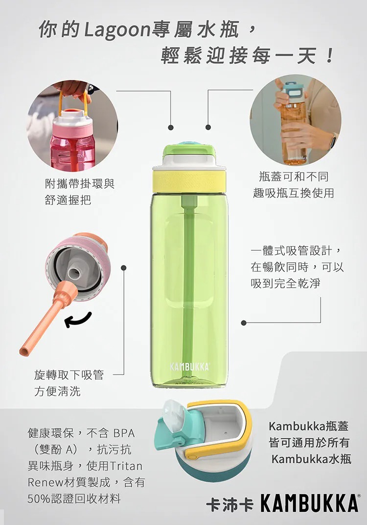 健康環保,不含 BPA(雙酚 A),抗污抗異味瓶身,使用Tritan Renew材質製成,含有50%認證回收材料