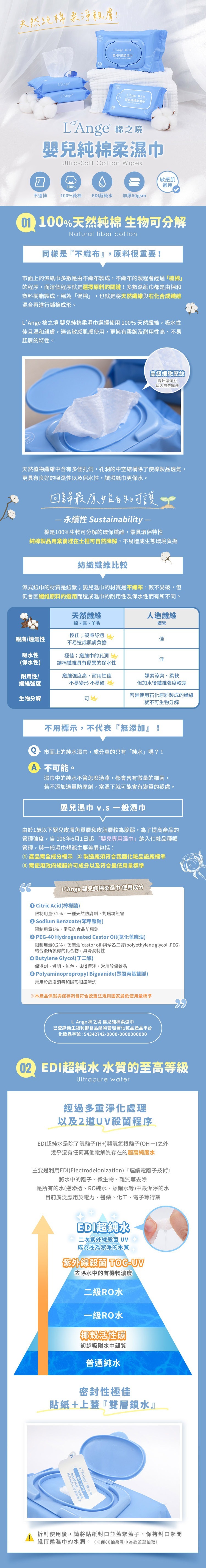 親膚透氣,具有良好的吸濕性、吸水性以及保水性,讓柔濕巾更鎖水;天然纖維,不易造成環境負擔