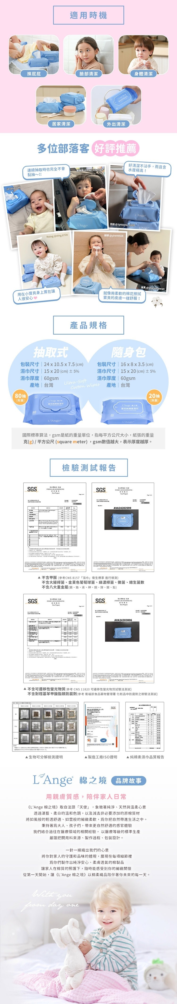 不含甲醛(參考CNS 8157「濕巾」衛生標準 進行檢測)、不含可遷移性螢光物質、不含八大重金屬,不含大腸桿菌、金黃色葡萄球菌、綠濃桿菌、黴菌、總生菌數,新生兒或敏感肌膚都適用