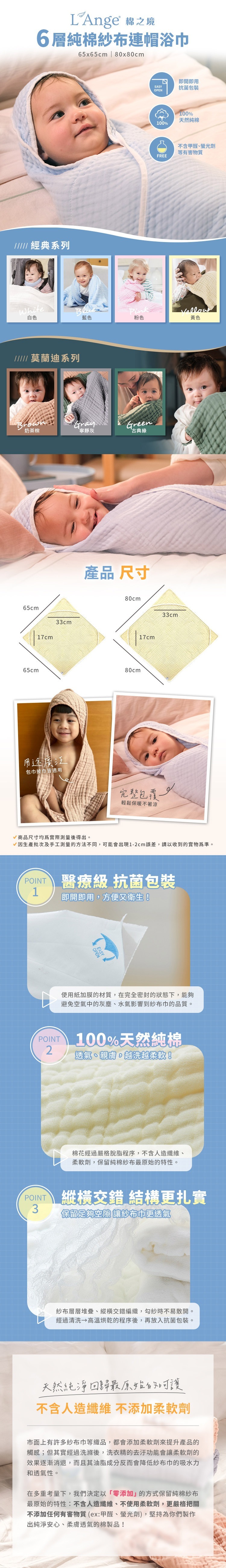 |L'Ange 棉之境 6層純棉紗布連帽浴巾|