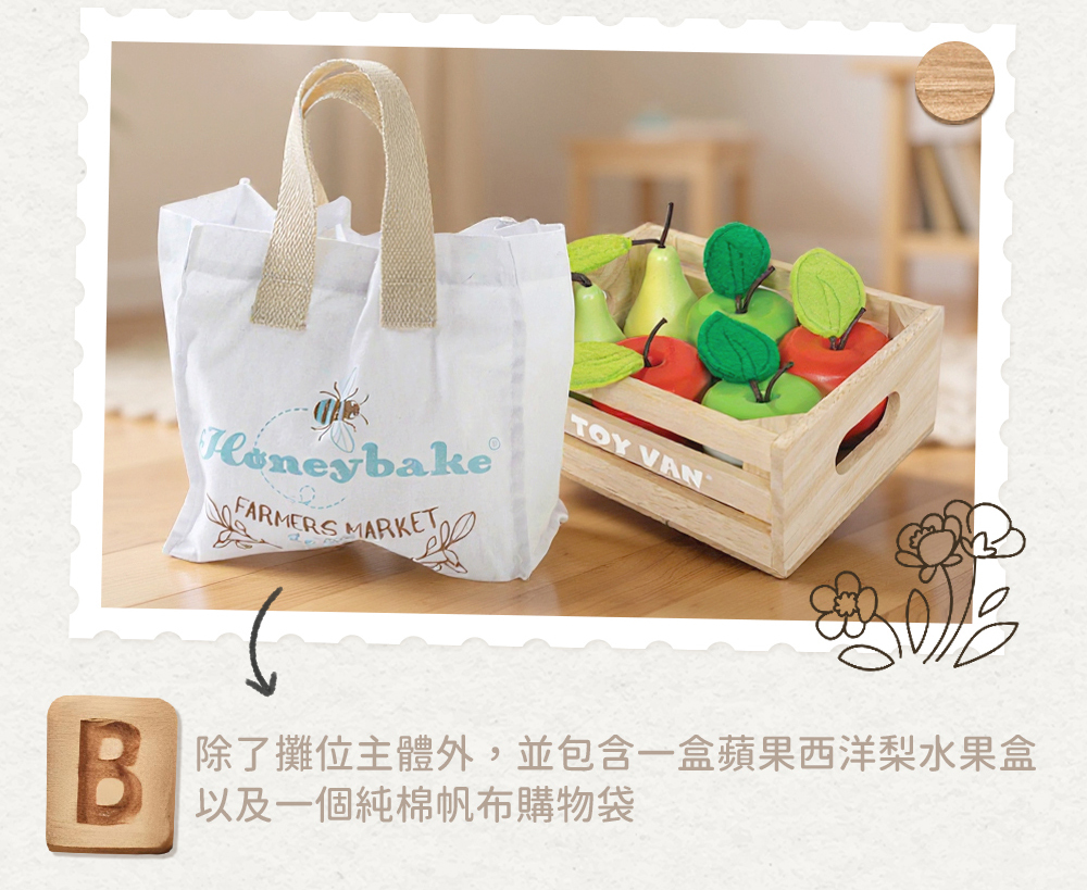 。除了攤位主體外,並包含一盒蘋果西洋梨水果盒以及一個純棉帆布購物袋