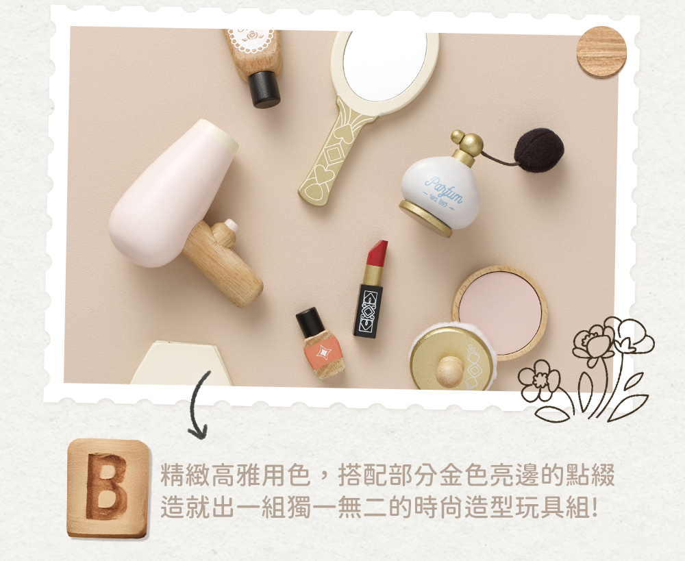 。精緻高雅用色,搭配部分金色亮邊的點綴,造就出一組獨一無二的時尚造型玩具組