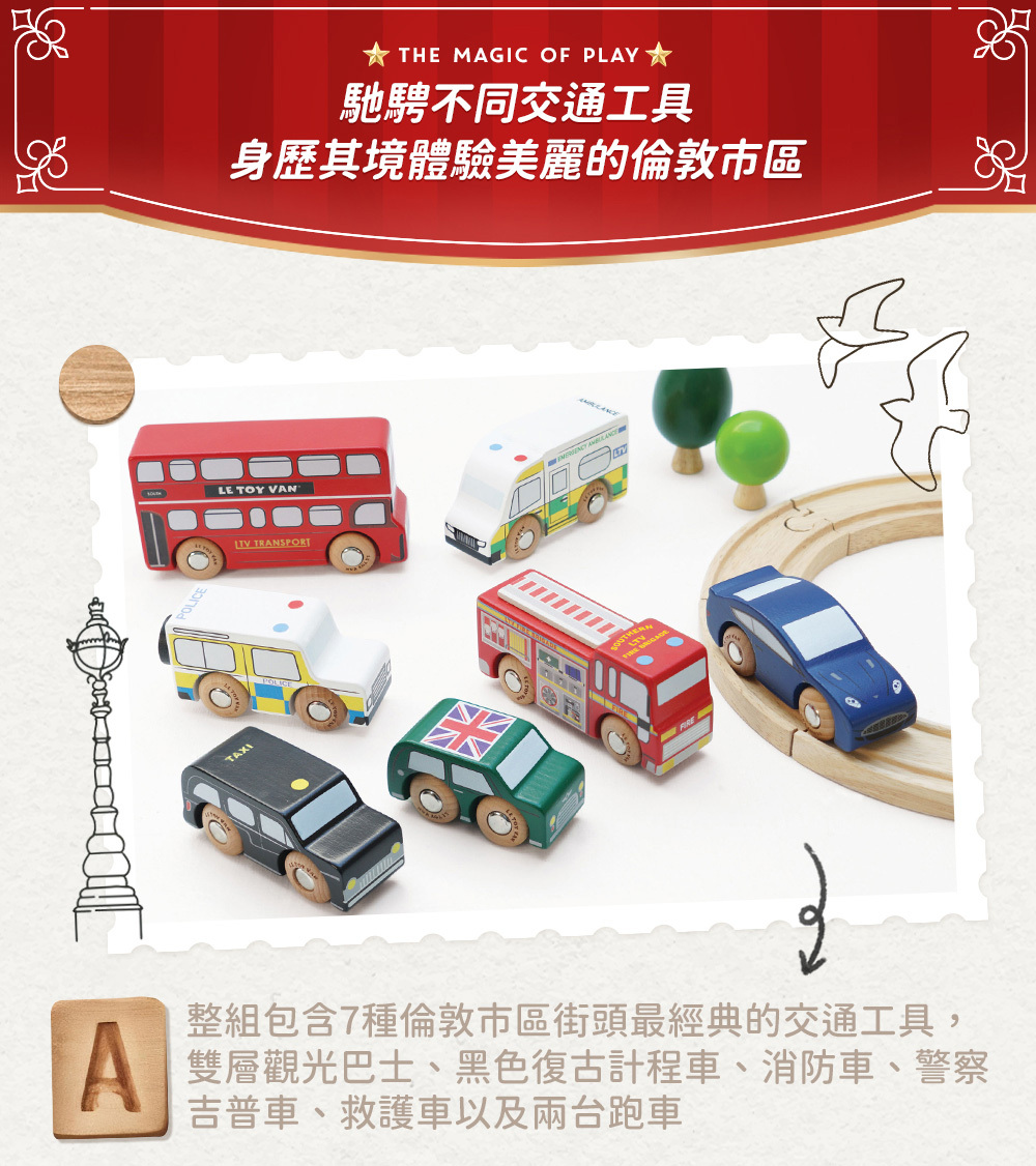 。整組包含7種倫敦市區街頭最經典的交通工具,雙層觀光巴士、黑色復古計程車、消防車、警察吉普車、救護車以及兩台跑車