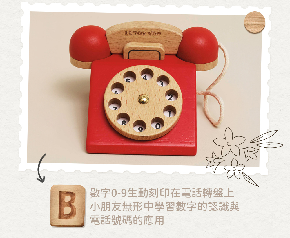 。數字0-9生動刻印在電話轉盤上,小朋友無形中學習數字的認識與電話號碼的應用