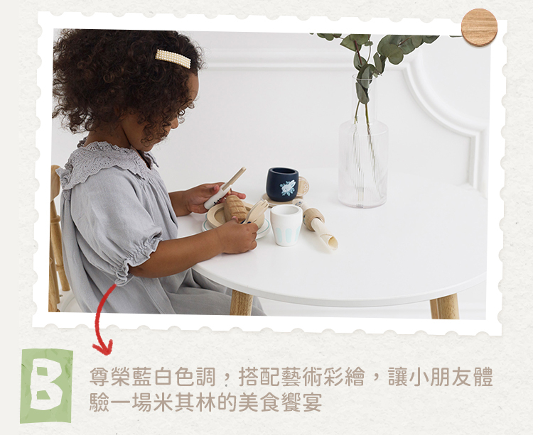 。尊榮藍白色調,搭配藝術彩繪,讓小朋友體驗一場米其林的美食饗宴