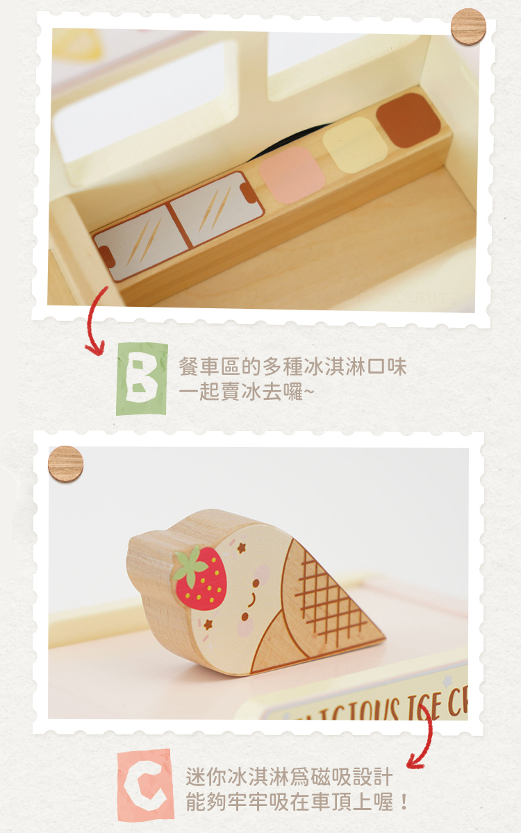 。復古經典柔和設計、大大車頂冰淇淋LOGO、立體造型車體設計、駕駛艙座後圓方向盤、餐車區的多種冰淇淋口味、搭配迷你冰淇淋和冰淇淋底座