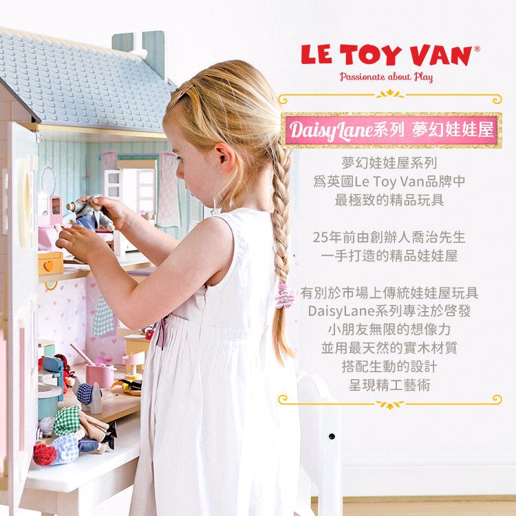 DaisyLane 夢幻娃娃屋系列是英國 Le Toy Van 品牌中最極致的精品玩具。25年前由創辦人喬治先生一手打造的精品娃娃屋。有別於市場上傳統娃娃屋玩具,DaisyLane 系列專注於啟發小朋友無限的想像力,並用最天然的實木材質,搭配生動的設計,呈現精工藝術