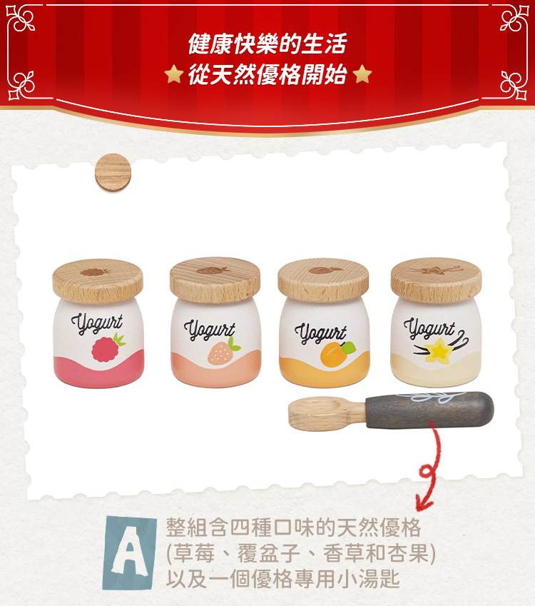 。整組含四種口味的天然優格 (草莓、覆盆子、香草和杏果),以及一個優格專用小湯匙