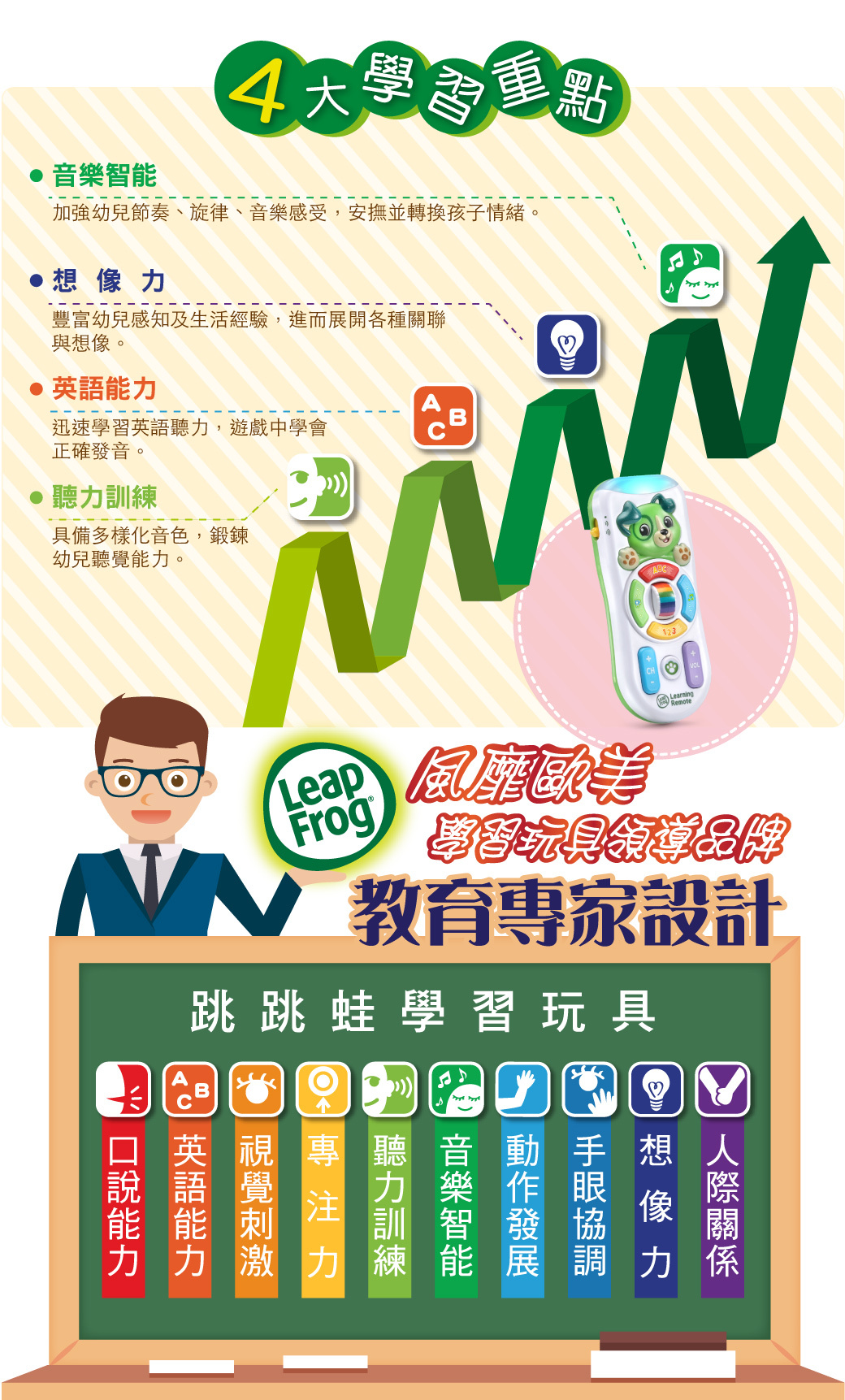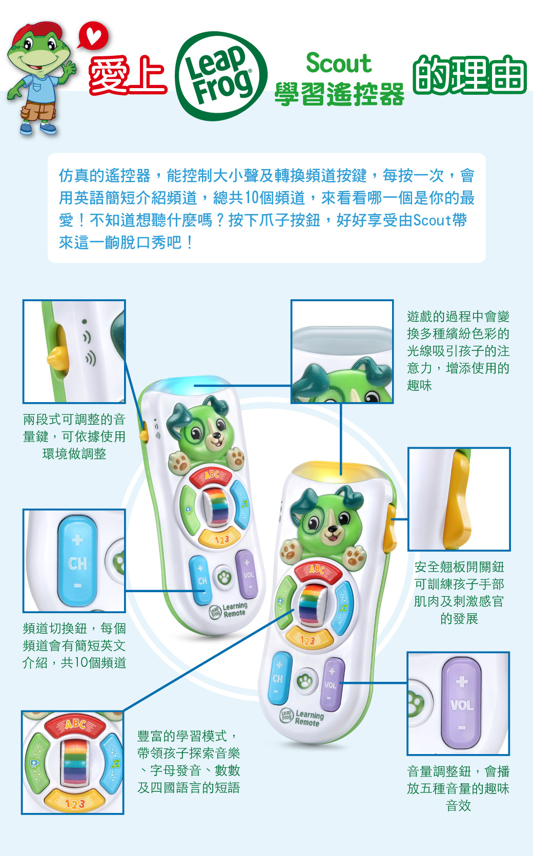 ●學習遙控器共9個按鈕,聆聽 100 多個短語,同時增強手部力量和協調性