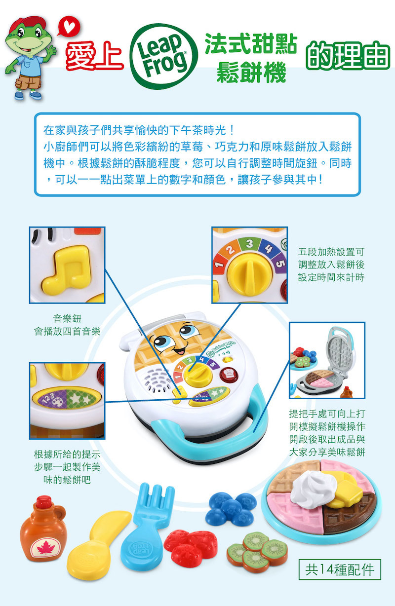 ●透過英文發音的鬆餅機,鼓勵孩子們在模擬製作的同時探索數數、顏色、音樂等等