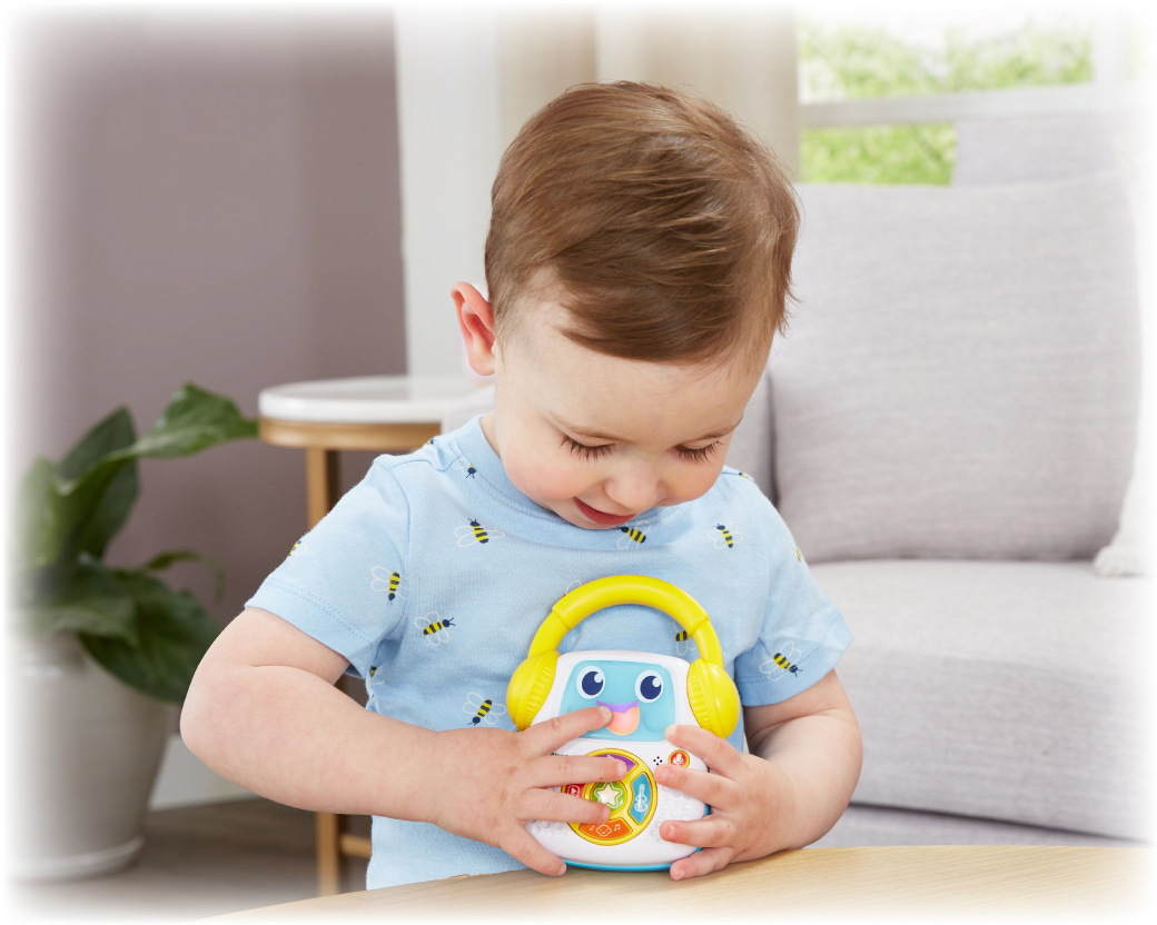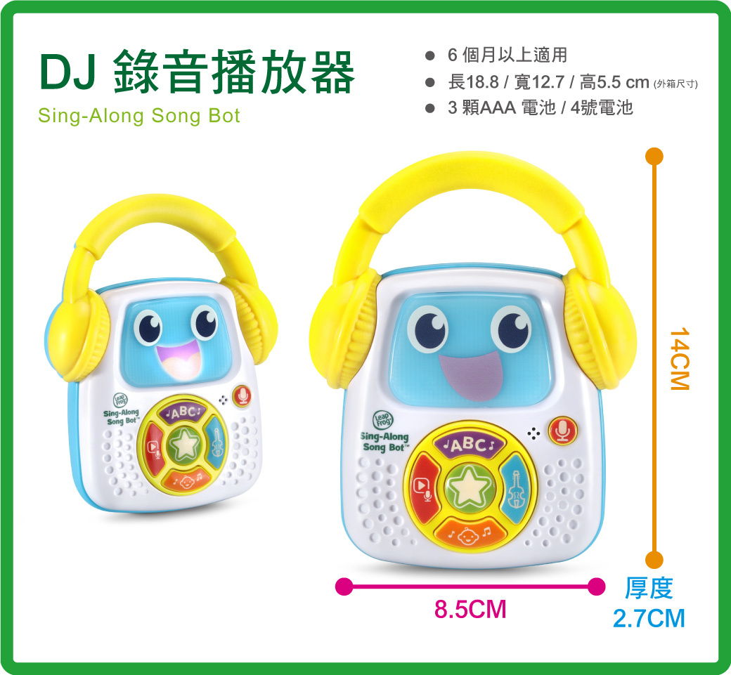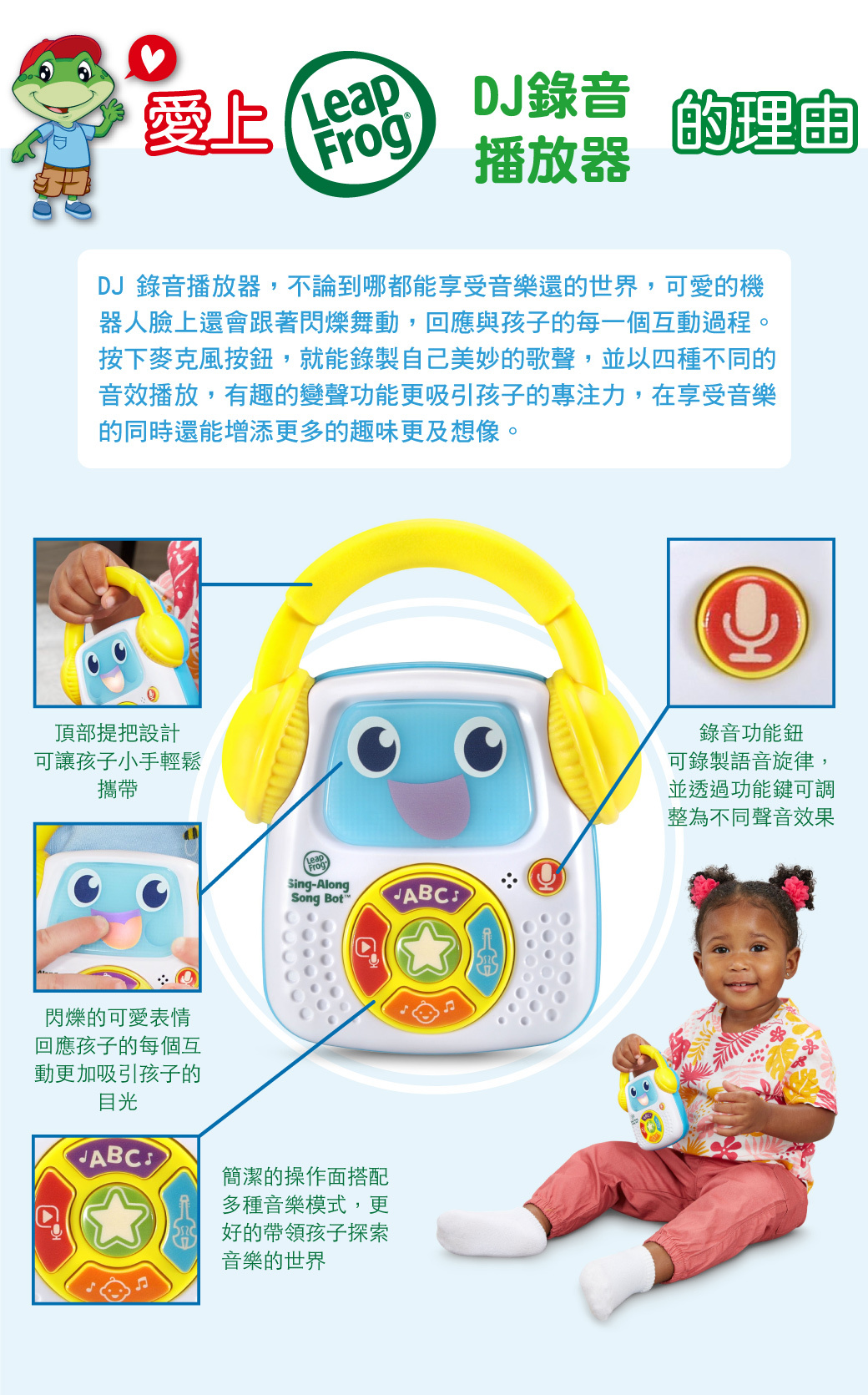 ●DJ 錄音播放器可聆聽各種曲風的音樂,過程中機器人臉上會跟著樂曲閃爍舞動