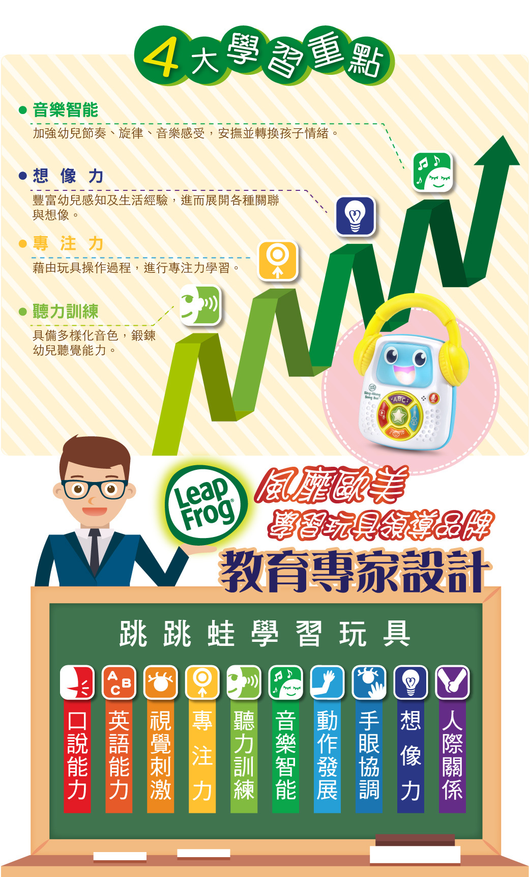 ●四種音樂按鍵,分別有即興演奏的英文歌曲、流行兒童歌曲、古典輕音樂