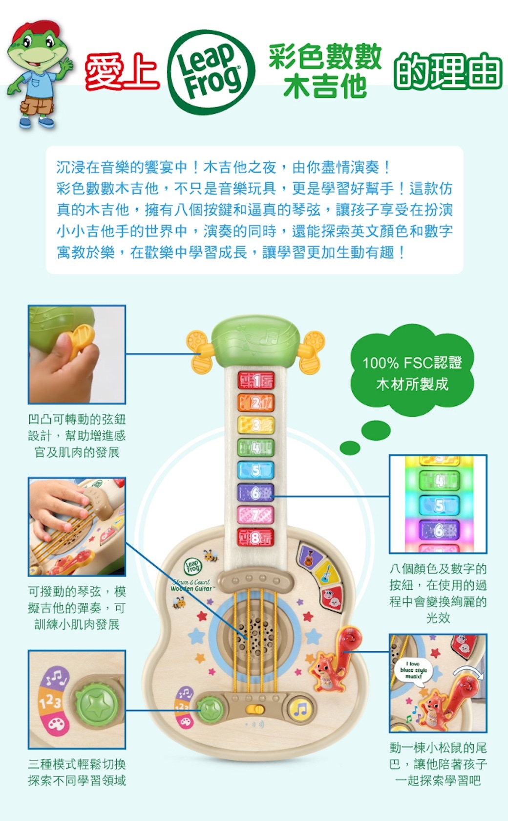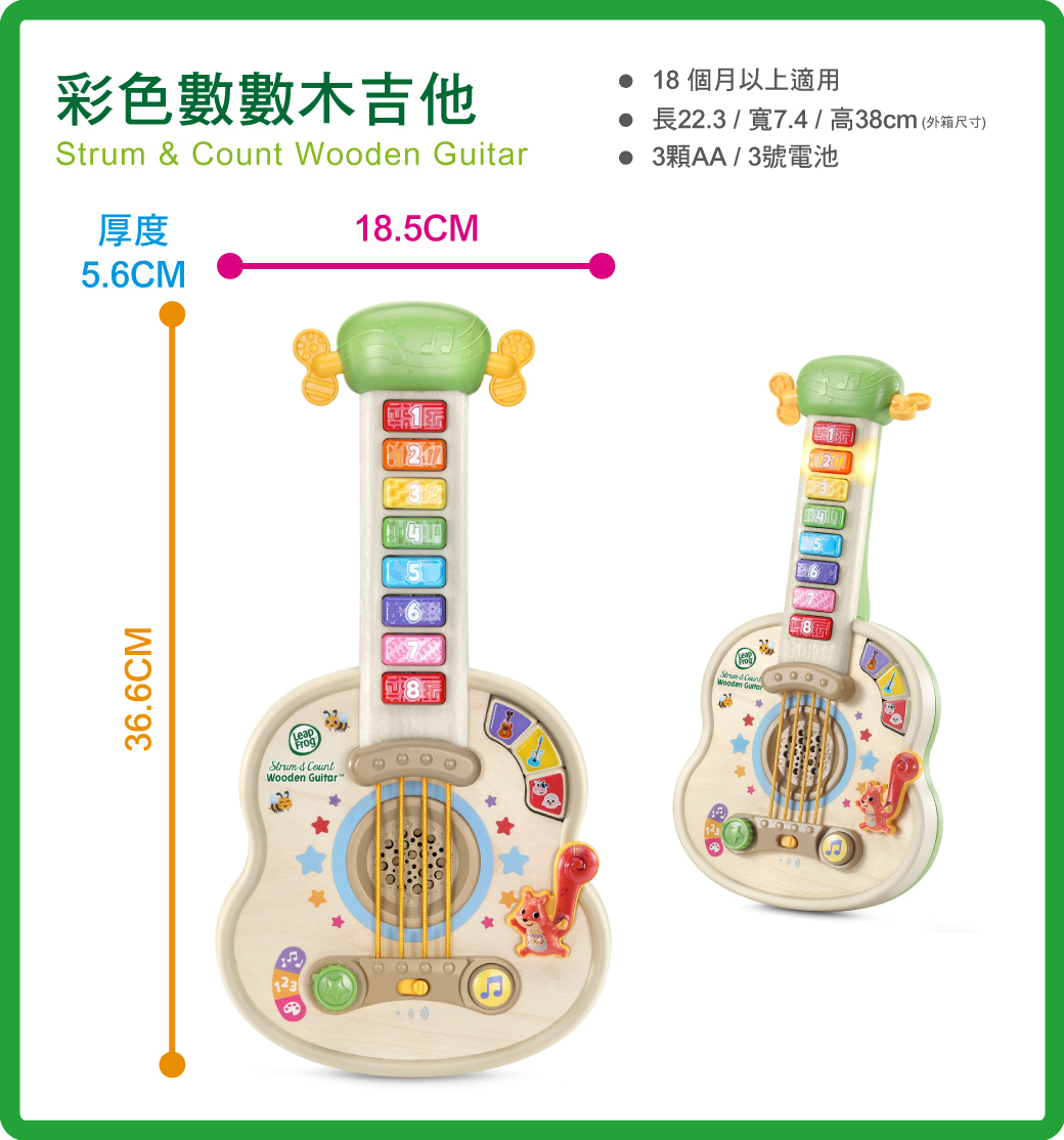 ●仿真的木吉他,上方弦鈕可旋轉調音,撥動琴弦彈奏,並按壓數字按鍵,演奏一首美妙歌曲