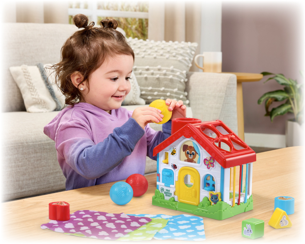 將積木配對於屋頂上正確的形狀槽。認識形狀及配對技巧
