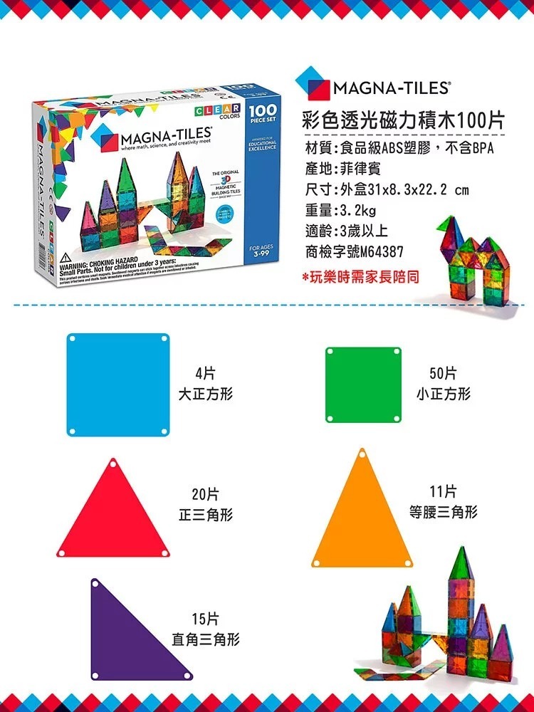Magna-Tiles®彩色透光磁力積木100片