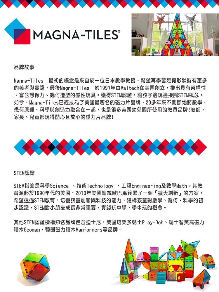 MAGNA-TILES®零件採食品級、無毒MABS塑料製成,不含BPA、鄰苯二甲酸鹽和乳膠。