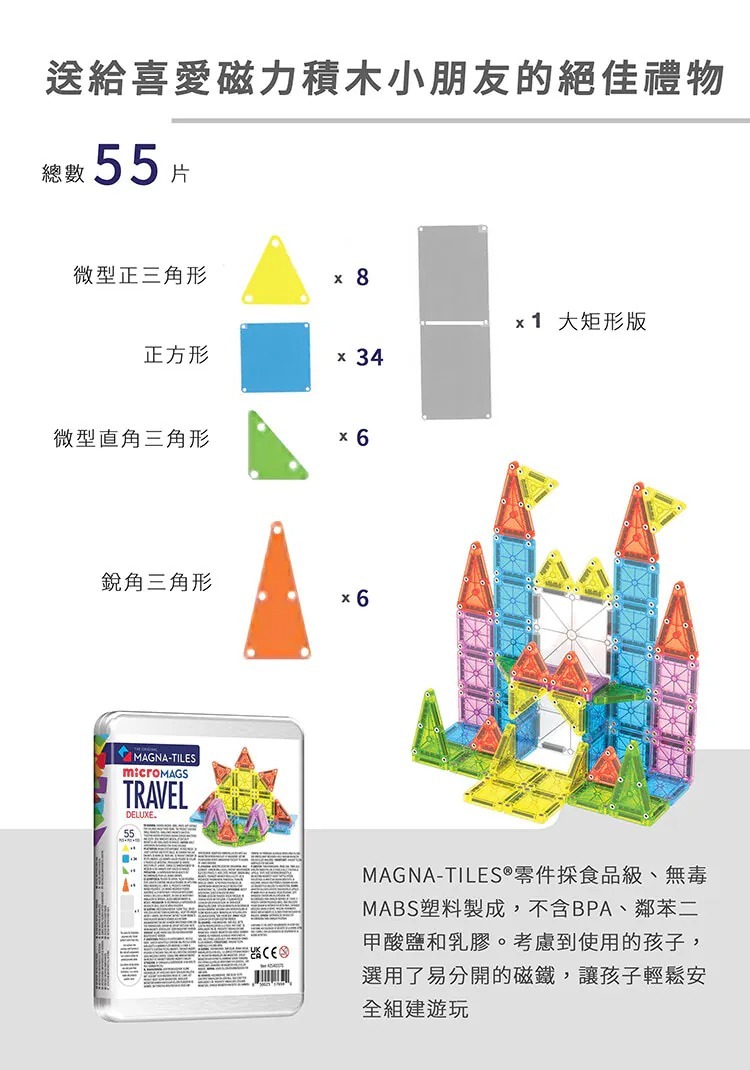 MAGNA-TILES®零件採食品級、無毒MABS塑料製成,不含BPA、鄰苯二甲酸鹽和乳膠。