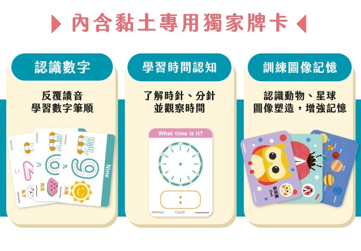 內容物:12色記憶黏土 紅 粉 橘 黃 草綠 藍綠 水藍 藍色 紫色 白色 灰色 黑色 黏土、黏土手冊、益智牌卡、黏土工具組、擬人配件組
