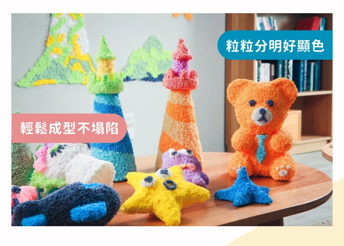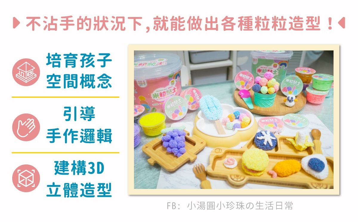 米粒黏土粒粒分明的觸感卻不沾手,粒粒分明的黏土表面能有效促進統感知覺發展,米粒黏土的特殊成分還讓孩子可隨時修改作品造型,可隨時替換顏色與部件,修改原始創作,是一款沒有修改次數限制的神奇黏土。