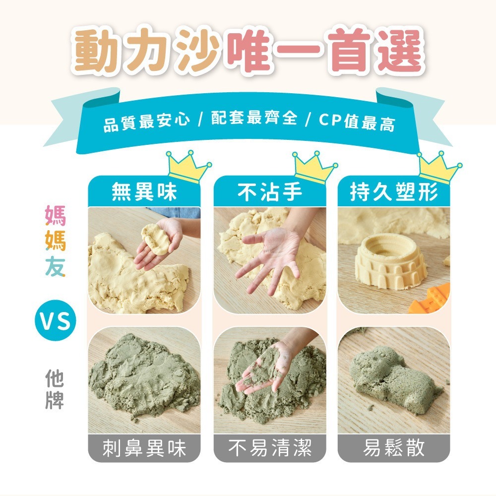 產品介紹:媽媽友動力沙通過歐盟CE認證安全無毒,動力沙由天然原色玻璃硃砂組成,不用擔心混色問題,本身不易致敏,不會變乾,還能重覆使用!額外添加抗菌成份,不擔心越玩越髒,可以刺激小朋友的想像力,方便堆疊成就孩子的成就感。