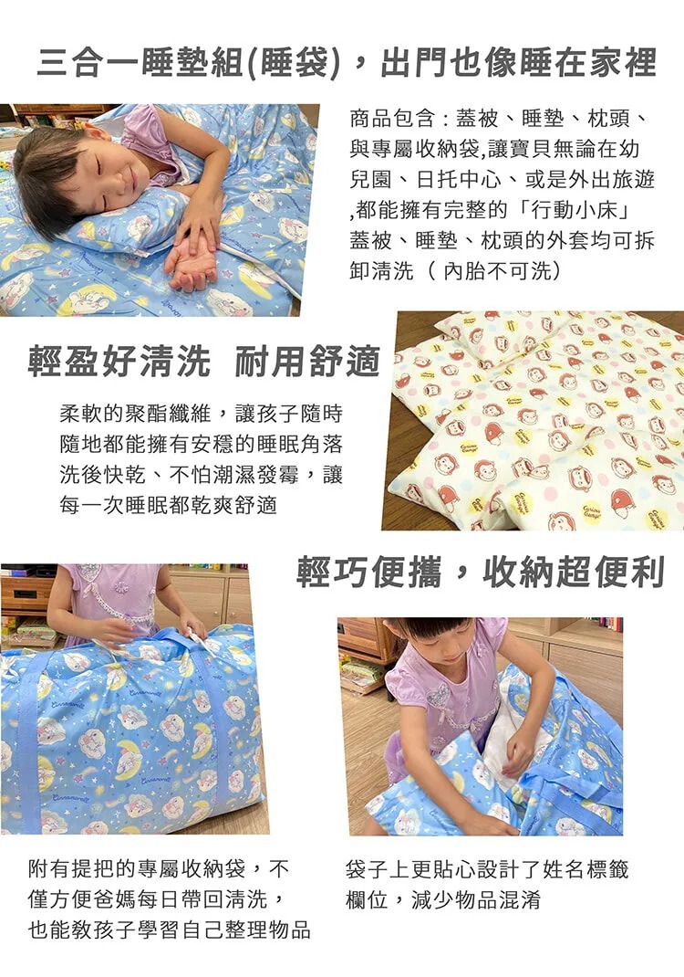 三合一睡墊組 (睡袋),讓寶貝在幼兒園、日托中心、或是外出旅遊,都能擁有安心舒適的行動小床