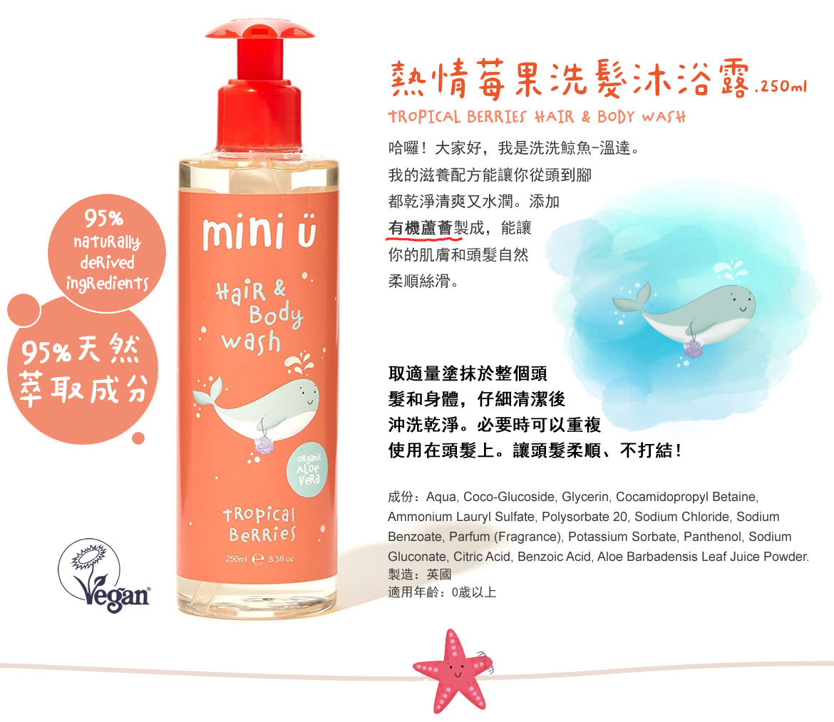 我的滋養配方能讓你從頭到腳都乾淨清爽又水潤。添加有機蘆薈製成,能讓你的肌膚和頭髮自然柔順絲滑。