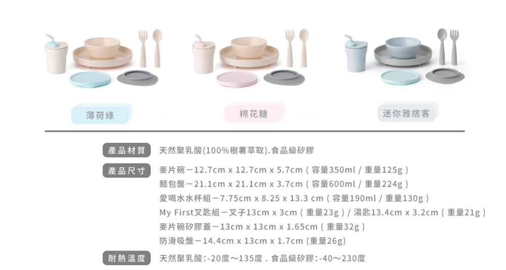內容物:天然聚乳酸麵包盤一入、天然聚乳酸麥片碗一入、聰明學習吸盤一入、矽膠保鮮蓋一入、My First! 叉匙組一入、愛喝水水杯組一入