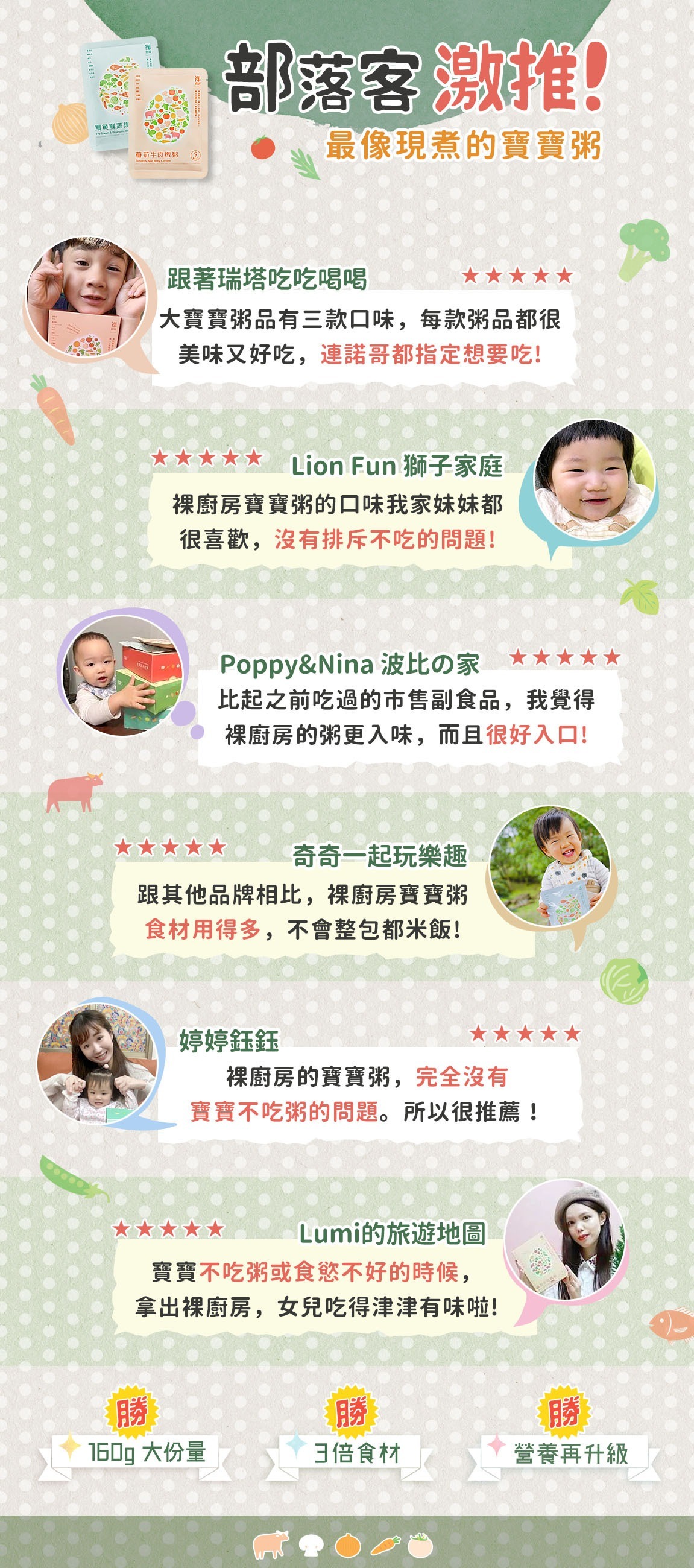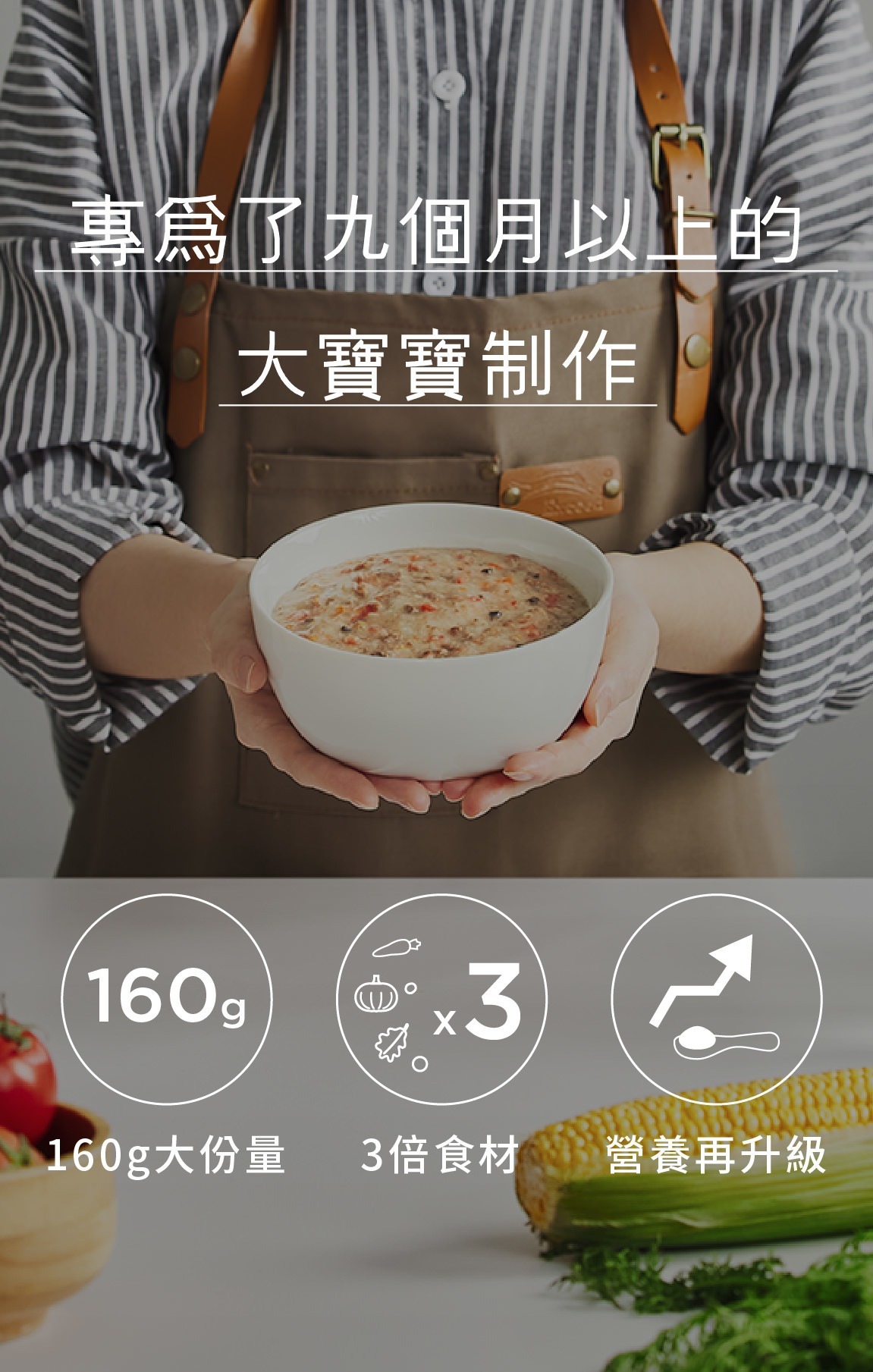和營養師共同開發的裸廚房常溫大寶寶粥, 食材跟米3:1的食材比例讓寶寶的營養更豐富, 嚴格使用優質食材及花東富里安心米, 每包160克容量更升級, 而且每個口味都用成品通過SGS檢驗, 讓寶寶吃得開心, 媽媽更放心!