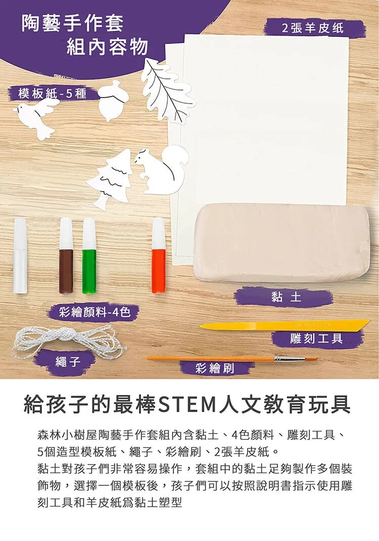 森林小樹屋陶藝手作套組內含黏土、4色顏料、雕刻工具、5個造型模板紙、繩子、彩繪刷、2張羊皮紙
